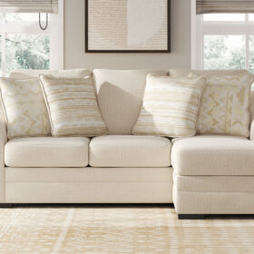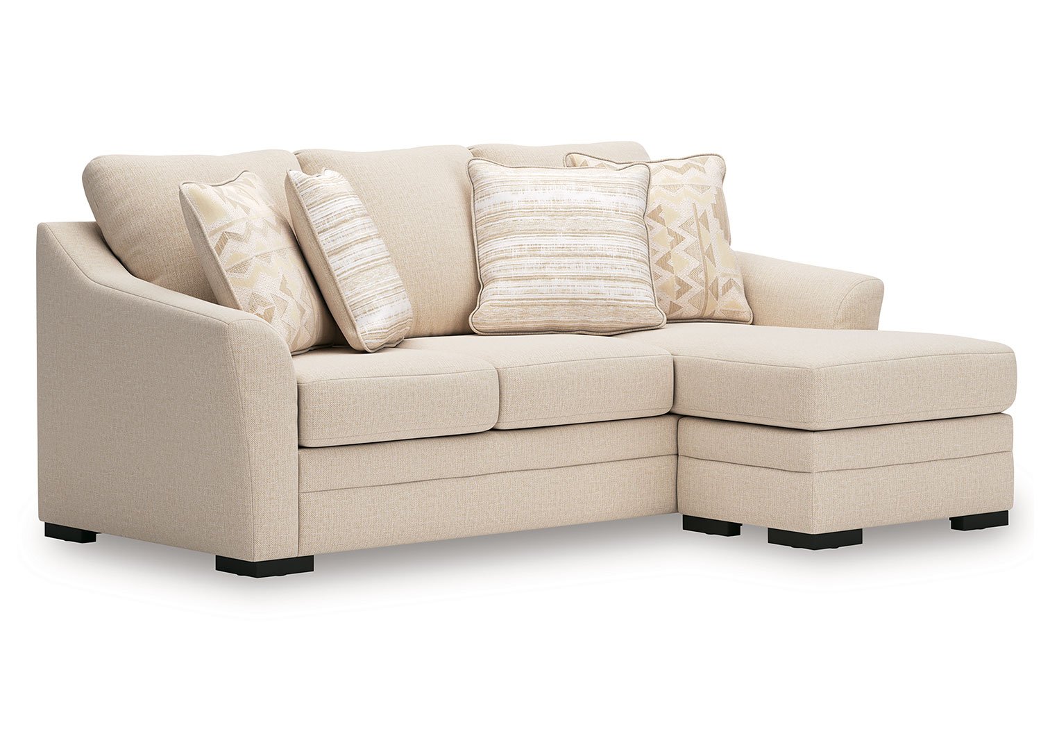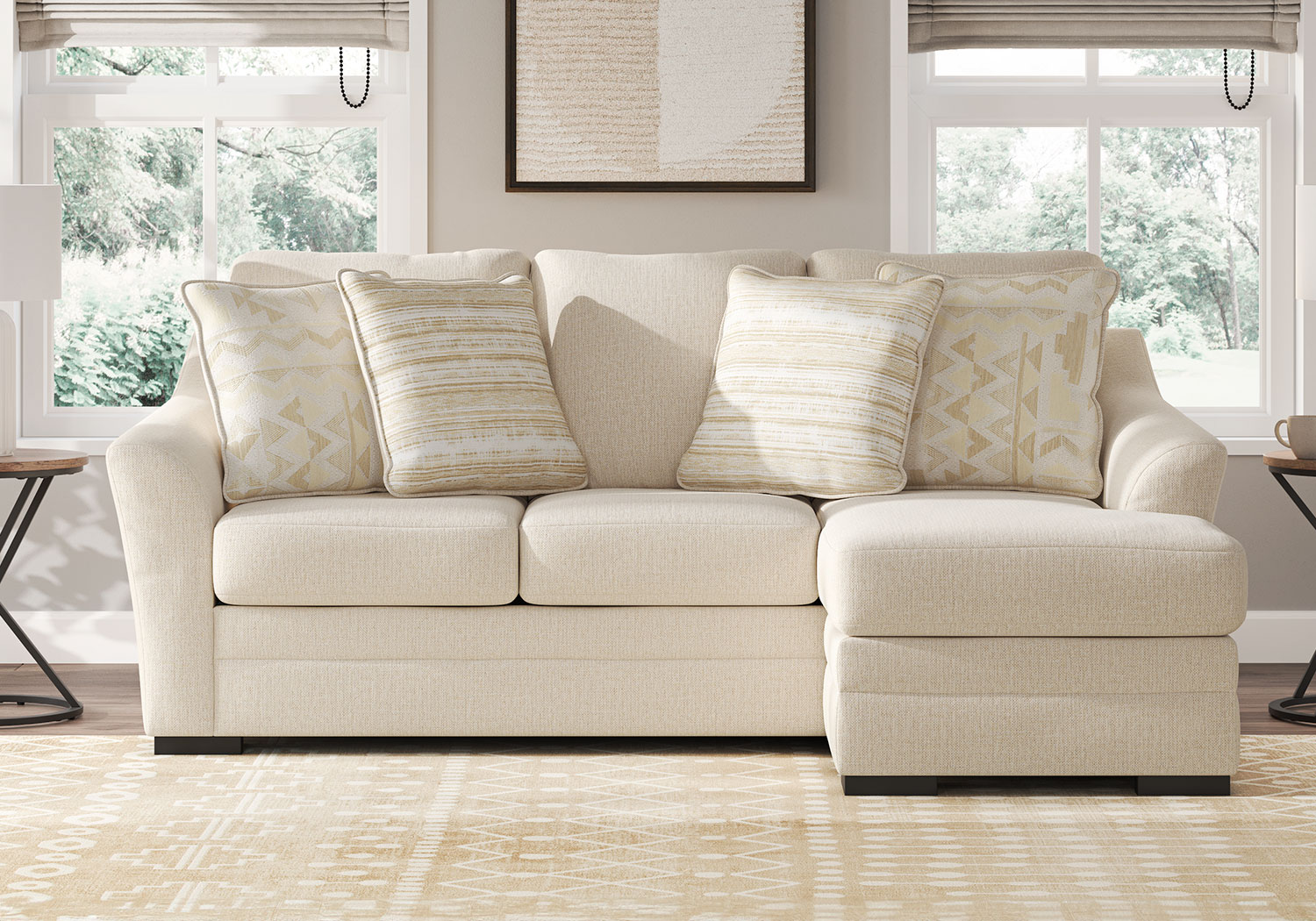 Corner-blocked frame. Reversible back and seat cushions. High-quality foam cushions wrapped in poly fiber. Chaise can be positioned on either side (thanks to reversible chaise cushion and movable ottoman). Pillows with soft polyfill. Polyester upholstery. Next-Gen Nuvella is a performance fabric that is soft, easy to clean, stain-resistant and durable. Easy-to-remove zippered covers for machine washing. Clean fabric with mild soap and water, let air dry; for stubborn stains, use a solution of 4 oz. bleach to 28 oz. water. Low-profile accent legs with faux wood finish. Platform foundation system resists sagging 3x better than spring system after 20,000 testing cycles by providing more even support. Smooth platform foundation maintains tight, wrinkle-free look without dips or sags that can occur over time with sinuous spring foundations.