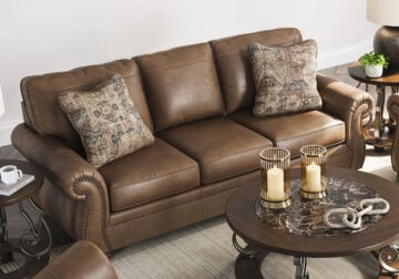 Everyone can have the best seat in the house with this Series. Its nailhead trim puts the finishing touches on the traditional roll arms you love. Comfy, durable cushions—wrapped in a rustic yet sophisticated faux leather—keep you feeling relaxed. Chenille Accents in a distressed motif pattern add another layer of comfort. Turned legs show that style and quality flow from top to bottom.