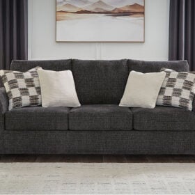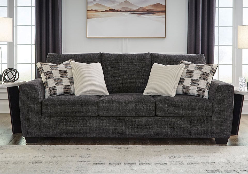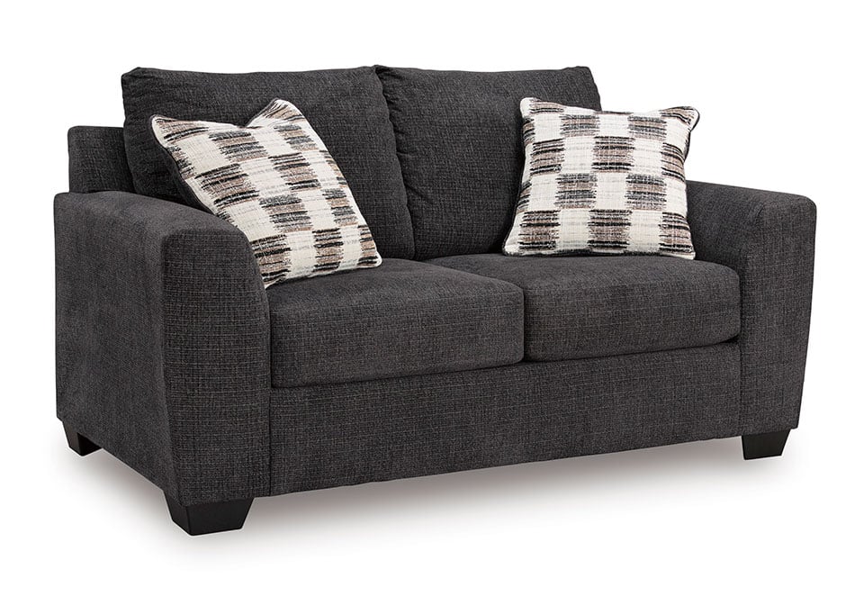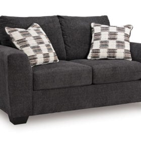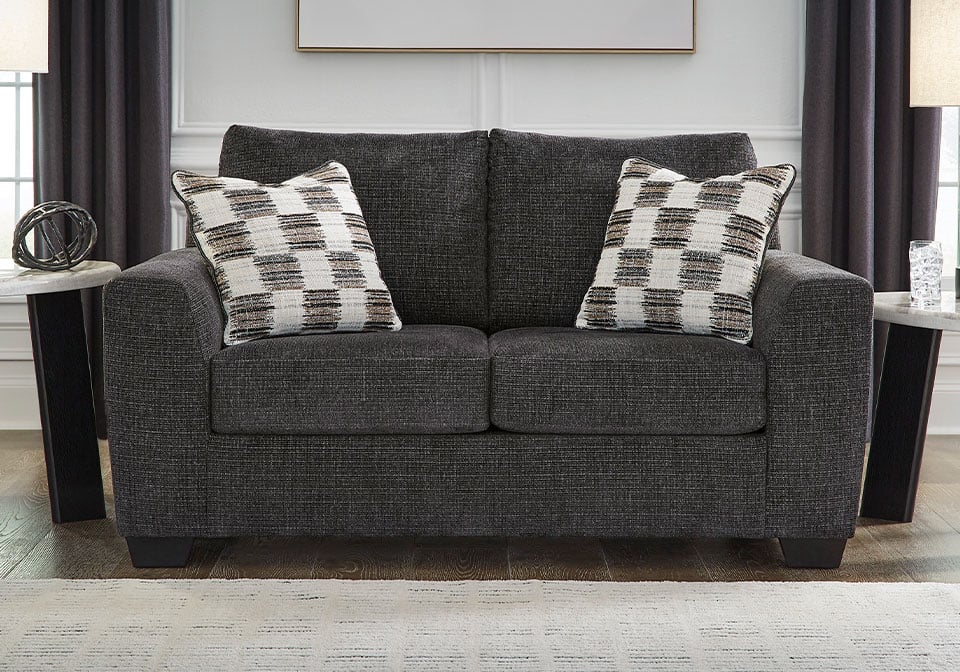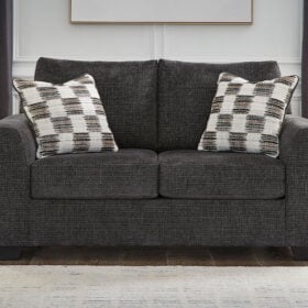 Reinforced frame provides added stability. Attached back and loose seat cushions. High-quality foam cushions wrapped in poly fiber. Pillows with soft polyfill. Polyester upholstery. Exposed feet with faux wood finish. Platform foundation system resists sagging 3x better than spring system after 20,000 testing cycles by providing more even support. Smooth platform foundation maintains tight, wrinkle-free look without dips or sags that can occur over time with sinuous spring foundations.