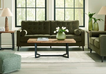 This Series strikes the perfect balance between elevated and eclectic. Contemporary lines and a richly hued velvet upholstery keep things chic. Design details like button tufting and splay legs add mod flair. It’s sure to keep your living room luxuriously on trend—at a price that won’t break the bank.