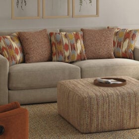 Soft, durable beige fabric upholstery. Clean, modern silhouette with low arms. Plush, deep seating for ultimate comfort. Vibrant, multi-pattern accent designs. Sturdy Steel frame for lasting support. Versatile neutral tones complement any décor.