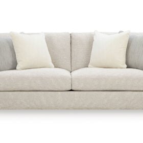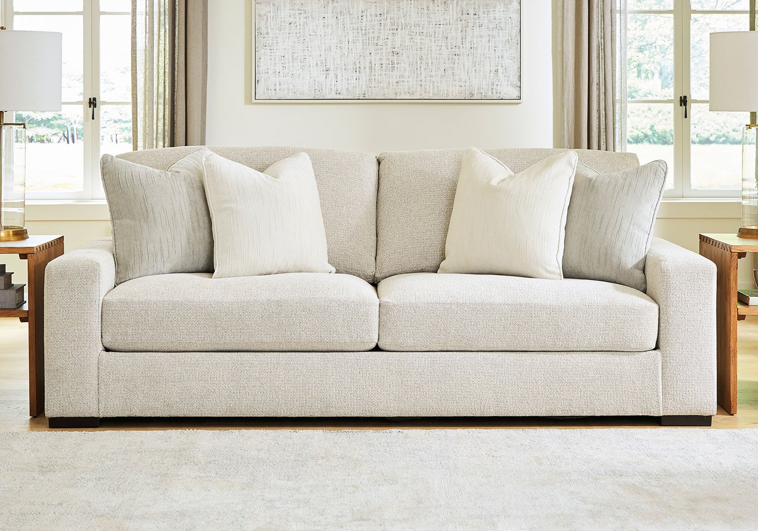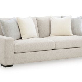 Reinforced frame provides added stability. Reversible seat and back cushions. High-density foam cushions wrapped in feather-fiber blend jacket. Pillows with feather-fiber blend. Polyester upholstery. Non-skid, low-profile accent legs with faux wood finish. Platform foundation system resists sagging 3x better than spring system after 20,000 testing cycles by providing more even support. Smooth platform foundation maintains tight, wrinkle-free look without dips or sags that can occur over time with sinuous spring foundations.