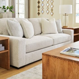 A triumph in transitional design, this Series invites you to indulge in complete comfort. The contemporary yet classically styled piece is covered in oh-so-soft boucle upholstery for a sense of stately sophistication. Decorative velvet pillows in muted hues complete the vibe.