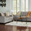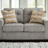 Corner-blocked frame. Attached back and loose seat cushions. High-quality foam cushions wrapped in poly fiber. Pillows with soft polyfill. Polyester upholstery. Exposed feet with faux wood finish. Platform foundation system resists sagging 3x better than spring system after 20,000 testing cycles by providing more even support. Smooth platform foundation maintains tight, wrinkle-free look without dips or sags that can occur over time with sinuous spring foundations.
