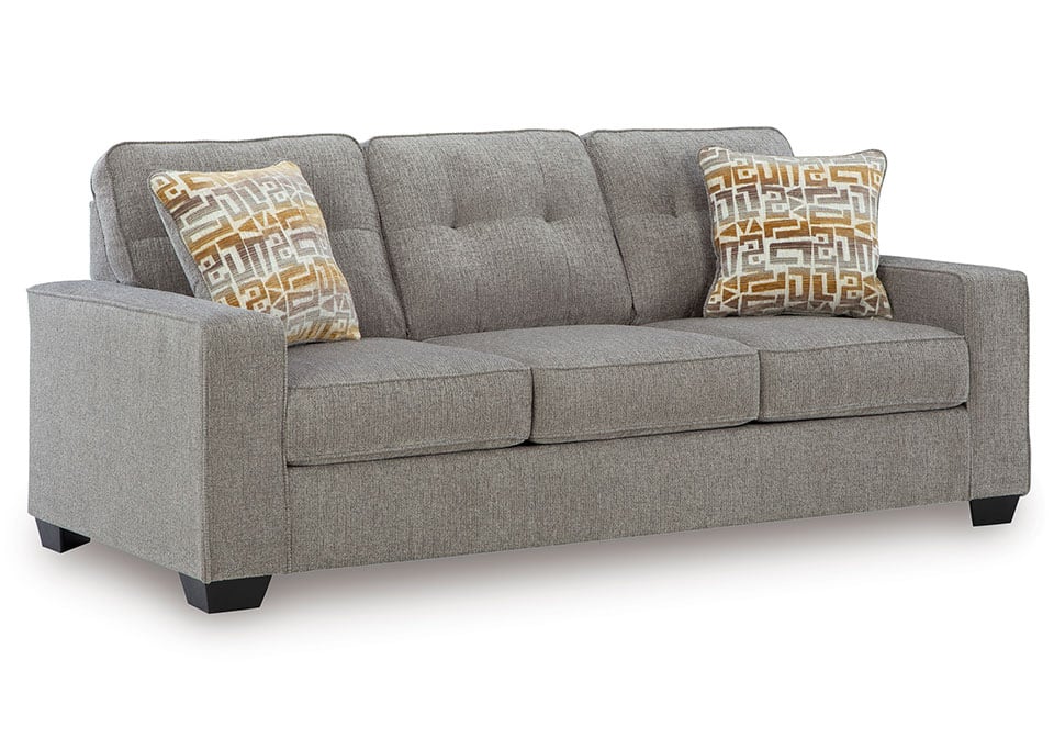 Corner-blocked frame. Attached back and loose seat cushions. High-quality foam cushions wrapped in poly fiber. Pillows with soft polyfill. Polyester upholstery. Exposed feet with faux wood finish. Platform foundation system resists sagging 3x better than spring system after 20,000 testing cycles by providing more even support. Smooth platform foundation maintains tight, wrinkle-free look without dips or sags that can occur over time with sinuous spring foundations.