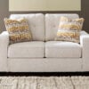 Corner-blocked frame. Attached back and loose seat cushions. High-quality foam cushions wrapped in poly fiber. Pillows with soft polyfill. Polyester upholstery. Exposed feet with faux wood finish. Platform foundation system resists sagging 3x better than spring system after 20,000 testing cycles by providing more even support. Smooth platform foundation maintains tight, wrinkle-free look without dips or sags that can occur over time with sinuous spring foundations.