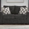 Reinforced frame provides added stability. Attached back and loose seat cushions. High-quality foam cushions wrapped in poly fiber. Pillows with soft polyfill. Polyester upholstery. Exposed feet with faux wood finish. Platform foundation system resists sagging 3x better than spring system after 20,000 testing cycles by providing more even support. Smooth platform foundation maintains tight, wrinkle-free look without dips or sags that can occur over time with sinuous spring foundations.