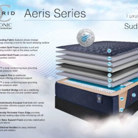 Ultra-Cooling Fabric with phase-change technology for a cool-to-the-touch sleep surface. Soft Comfort Quilt Foam for soft, conforming comfort. Firm Comfort Quilt Foam for firm, supportive comfort. Serene™ Foam comfort layer for enhanced pressure relief. Fiber Support Pad for added firmness and support. Medium Comfort Bridge stabilizes comfort layers and coil unit. 8″ 960 Individually Encased Coil Unit with center zoning to reduce motion transfer. High-Density Perimeter Foam Edge for enhanced edge support and reduced roll-off. Medium Base Support Foam for overall mattress stability. 4 Box-Stitched Handles for easy mattress rotation and placement.