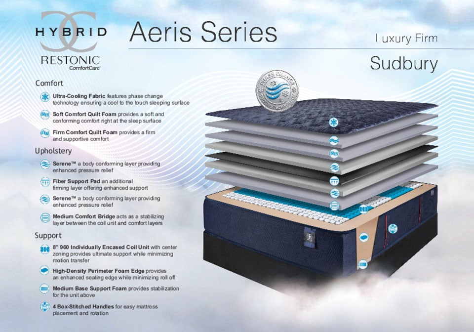 Experience luxury firm comfort with the Restonic Hybrid Aeris Sudbury mattress, featuring ultra-cooling fabric, serene pressure-relieving foam, and zoned individually encased coils. Reinforced edge support, reduced motion transfer, and breathable layers deliver cool, stable, restorative sleep night after night comfortably.