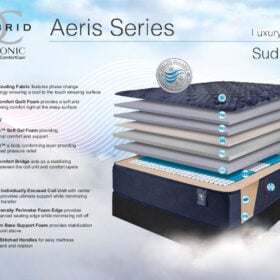 Ultra-Cooling Fabric with phase-change technology for a cool-to-the-touch sleep surface. Soft Comfort Quilt Foam for soft, conforming surface comfort. Aurora™ Soft Gel Foam for enhanced comfort and support. Serene™ Foam comfort layer for pressure-relieving body conformity. Soft Comfort Bridge stabilizes comfort layers and coil unit. 8″ 960 Individually Encased Coil Unit with center zoning to minimize motion transfer. High-Density Perimeter Foam Edge for enhanced seating edge support and reduced roll-off. Medium Base Support Foam for mattress stability. 4 Box-Stitched Handles for easy mattress placement and rotation.