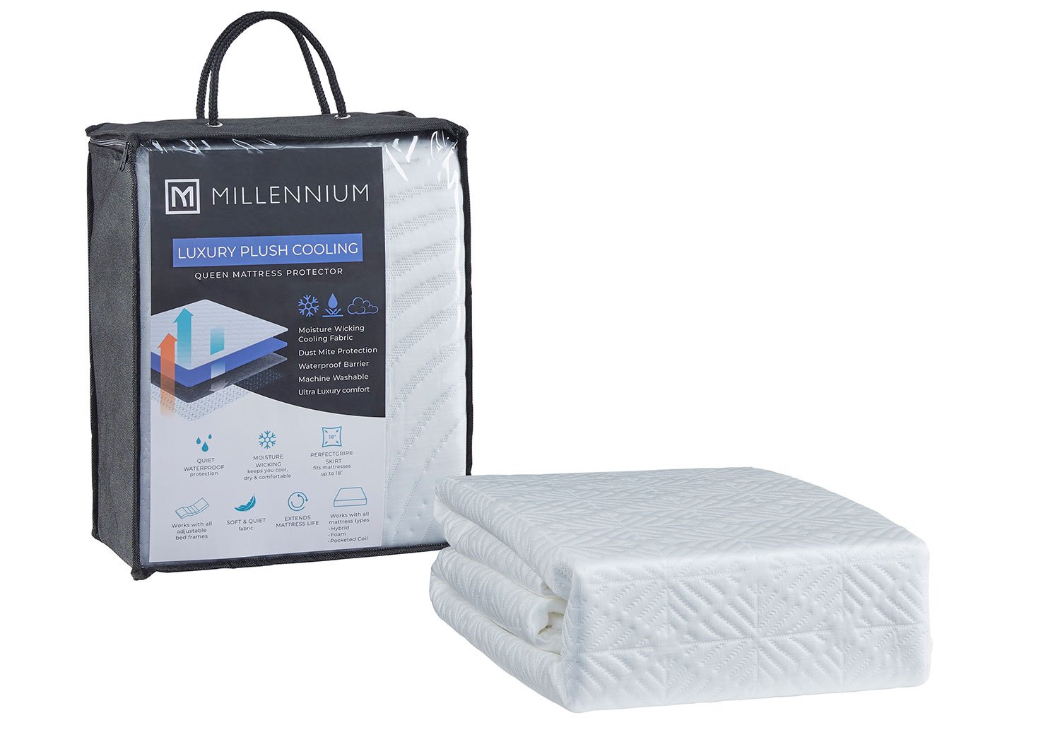 Made of super-soft bamboo fabric. Provides cool-to-the-touch comfort for natural temperature regulation. Fits mattresses up to 18” thick. Quiet waterproof barrier protects your mattress without affecting its feel. Repels dust mites; resists stains and fluids. Power base compatible. 10-year warranty. Hybrid, foam and innerspring mattress compatible. Machine washable. Imported.