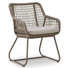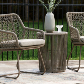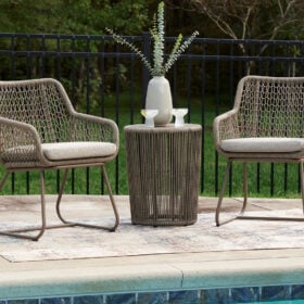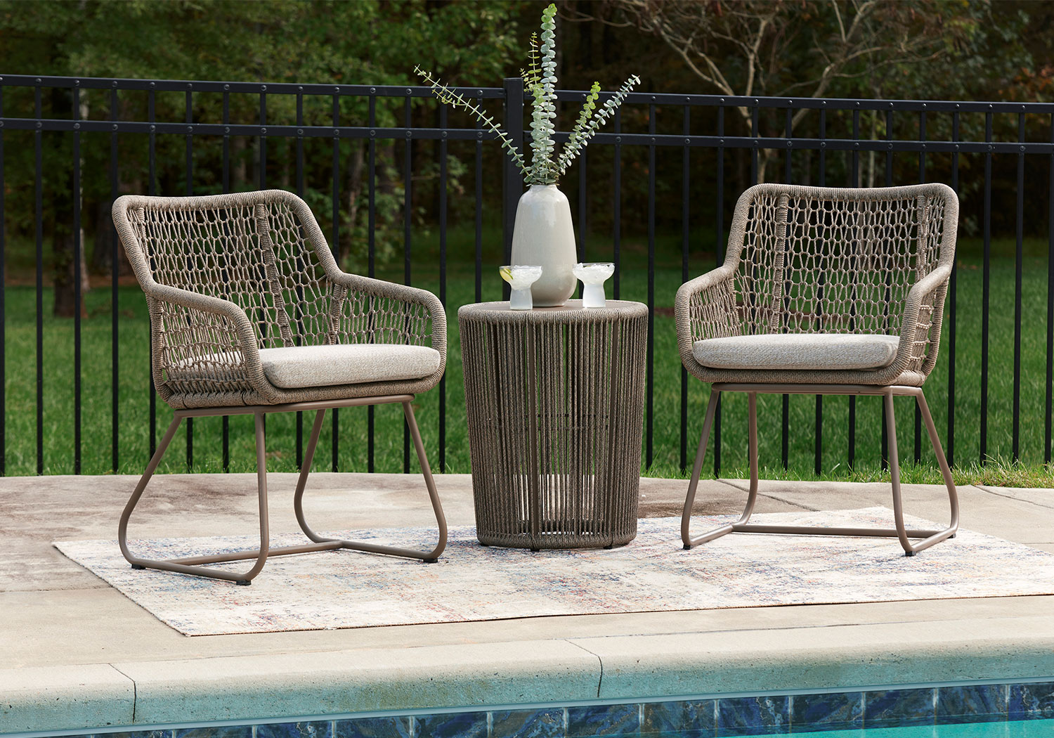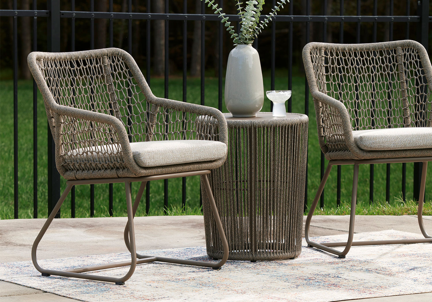On-trend style, made for outdoor living. This outdoor table and chair set impresses with its contemporary vibe and durable construction. Detailed rope designs on sturdy aluminum frames make a chic impression. And with UV-resistant performance fabric, the cushions stay vibrant as they weather the elements.