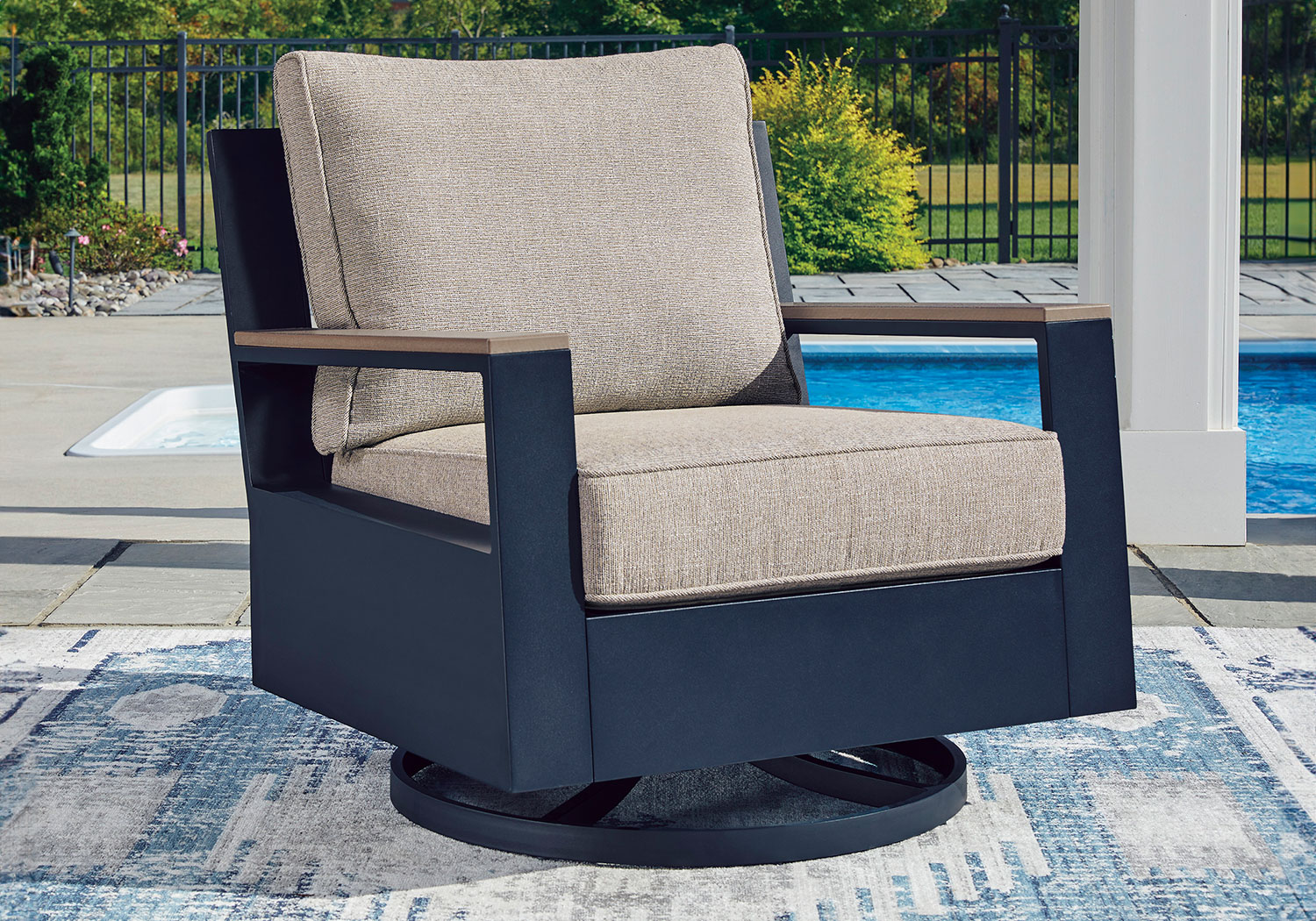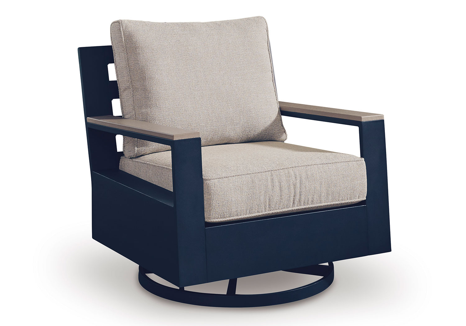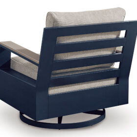Easy-breezy beauty, made to withstand the elements. This outdoor swivel glider lounge chair makes a serene statement with its soothing shade of blue and contrasting wood-look arms. A cushioned seat and back keep you comfy as you lounge. Crafted with durable materials for added longevity, it’s a smartly stylish addition to your outdoor oasis.