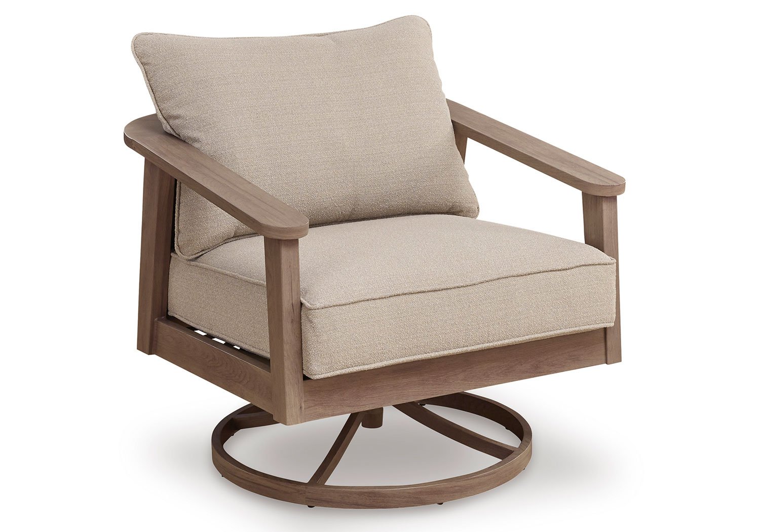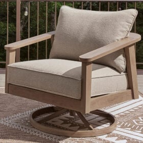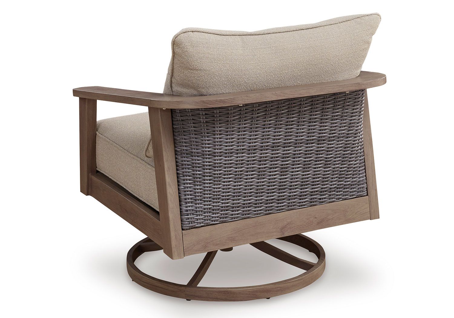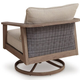High style, meet sleek durability. This outdoor swivel rocker lounge chair combines a contemporary silhouette with must-have longevity, so you can bring your eye for design alfresco. It impresses with the refined appeal of woven resin wicker and wood-look aluminum in a chic neutral color. And for easy cleanability and UV resistance, high-performing Nuvella® fabric covers the cushions.