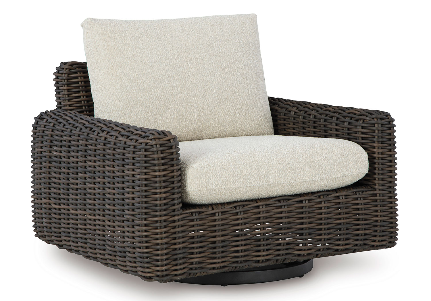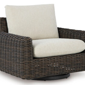 Add luxury, comfort and durability to alfresco fun. This outdoor swivel glider lounge chair captures the textural beauty of wicker while withstanding the elements, from rain to shine. With a UV-resistant design, the wonderfully low-maintenance Nuvella+™ fabric maintains its good looks over time. Deep, roomy seating completes the piece, offering ample space to sprawl out.