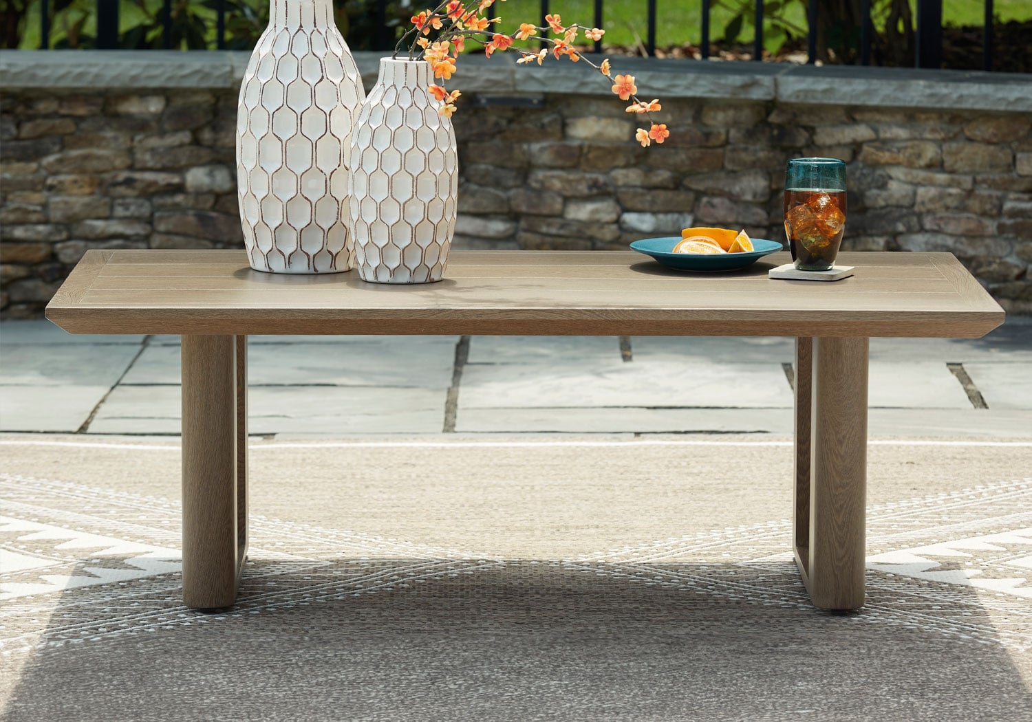 Elevate the appeal of easy-breezy living with this outdoor coffee table. Made to look like wood yet durable enough to weather the elements, it’s sure to serve you and your besties well, year after year. This table’s cool character is made for warm memories.