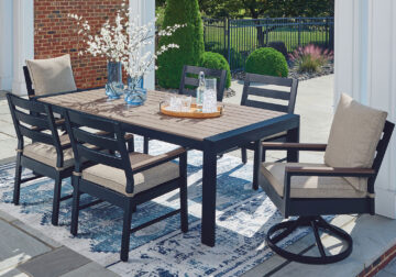 Easy-breezy beauty, made to withstand the elements. With its soothing shade of blue and contrasting wood-look, this outdoor dining set makes a serene statement on your deck or patio. A cushioned seat and back keep you comfy as you lounge. Crafted with durable materials for added longevity, it’s a smartly stylish addition to your outdoor oasis.
