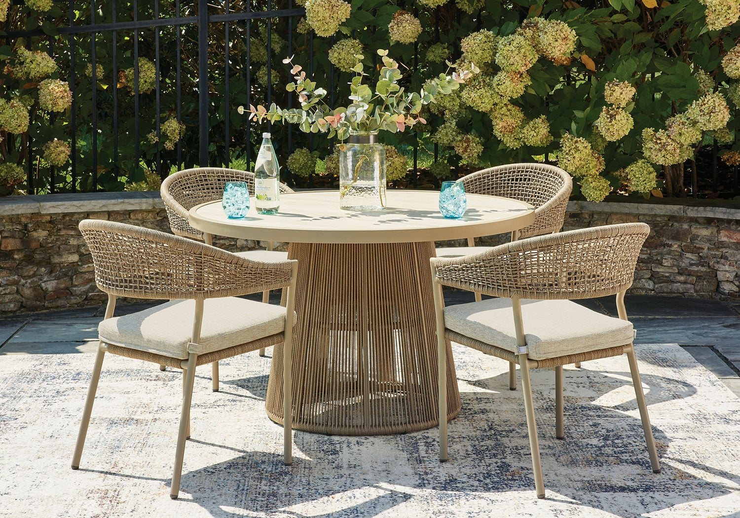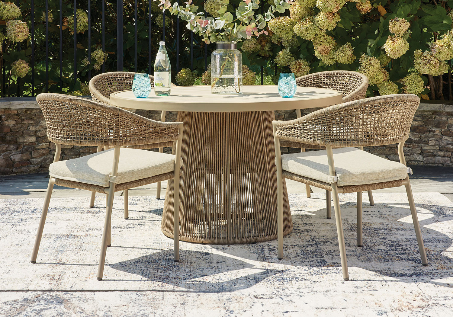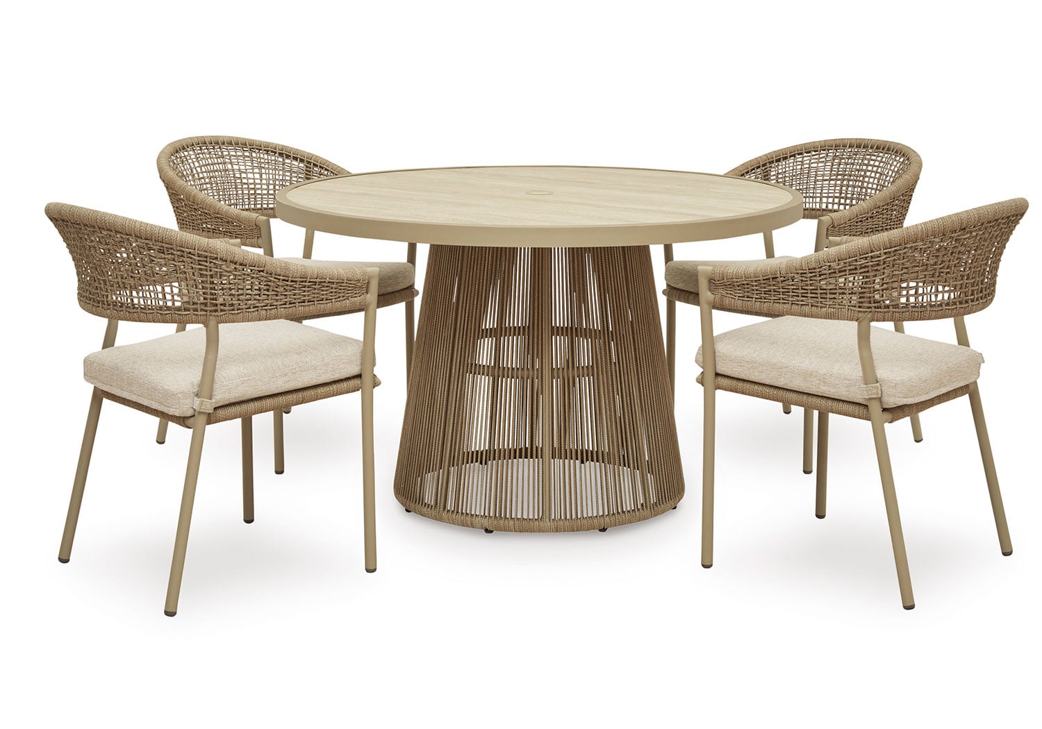 Whether decking out your deck or patio or making a splash by the pool, this outdoor dining set is all about easy-breezy outdoor living. Its gently curved back features a nicely neutral polyester rope wrap over a sturdy, rust-resistant aluminum frame that’s sure to weather the seasons beautifully. The cushion is covered in high-performance Nuvella® fabric that withstands the elements and is oh-so-easy to clean.
