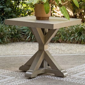Who says the great outdoors isn’t made for luxury living? This outdoor end table offers all of the high-end design and durability you could ask for, and then some. Its all-weather, rust-resistant aluminum frame provides the easy-breezy look you love without the high maintenance. Rest assured—with this table, you can focus less on upkeep and more on relaxation.