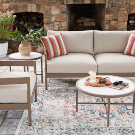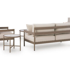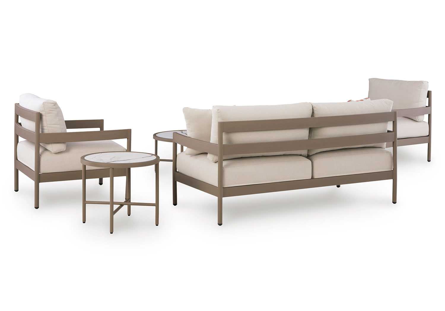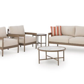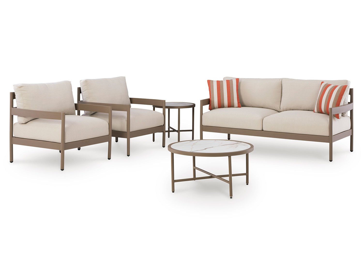 Indulgently comfortable furniture shouldn’t be limited to inside spaces. Create your own outdoor oasis with this 5-piece outdoor ensemble. It’s a study in form and function, with clean-lined, durable aluminum frames that are ready for many seasons of fun in the sun. Plush lounge chair and loveseat cushions wrapped in high-performing Nuvella® fabric are comfortable and carefree, while sintered stone tabletops lend an air of natural elegance.