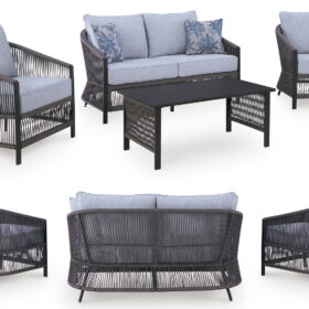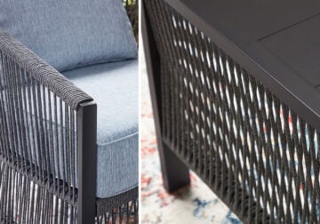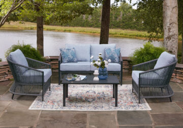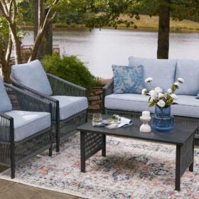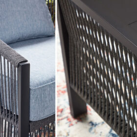 Ready to bring indoor style to your outdoor space? This beautiful 4-piece table and chair set is the perfect choice for creating a cozy patio retreat. A unique rope design lends the loveseat and lounge chairs a light and airy feel, while plush cushions wrapped in cleanable, UV-resistant fabric provide deep-seated comfort. And the table is just the spot to rest cocktails and coffee cups while you enjoy warm days and cool evenings with friends and family.