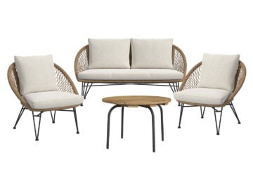 Elevate your outdoor living with this stylish four piece patio set featuring a loveseat two armchairs and a sleek table combining comfort durability and modern design perfect for relaxing entertaining and enjoying sunny days in any outdoor space beautifully designed
