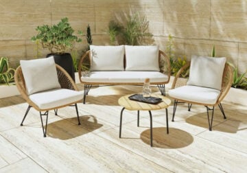 Elevate your outdoor living with this stylish four piece patio set featuring a loveseat two armchairs and a sleek table combining comfort durability and modern design perfect for relaxing entertaining and enjoying sunny days in any outdoor space beautifully designed