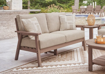 Natural neutrals are all the rage. Embrace the style trend with this outdoor loveseat. Crafted with MEGA-TUFF™ HDPE material, this chair combines the exceptional durability and weather resistance you need with the wood look you love. Comfy cushions wrapped in our high-performing, low-maintenance Nuvella® fabric offer stylish and durable appeal, taking outdoor living to a whole new level. Coordinating accent pillows add a wonderful layer of interest.