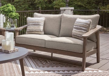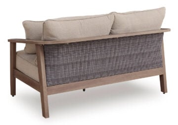 High style, meet sleek durability. This outdoor loveseat combines a contemporary silhouette with must-have longevity, so you can bring your eye for design alfresco. It impresses with the refined appeal of woven resin wicker and wood-look aluminum in a chic neutral color. And for easy cleanability and UV resistance, high-performing Nuvella® fabric covers the cushions.