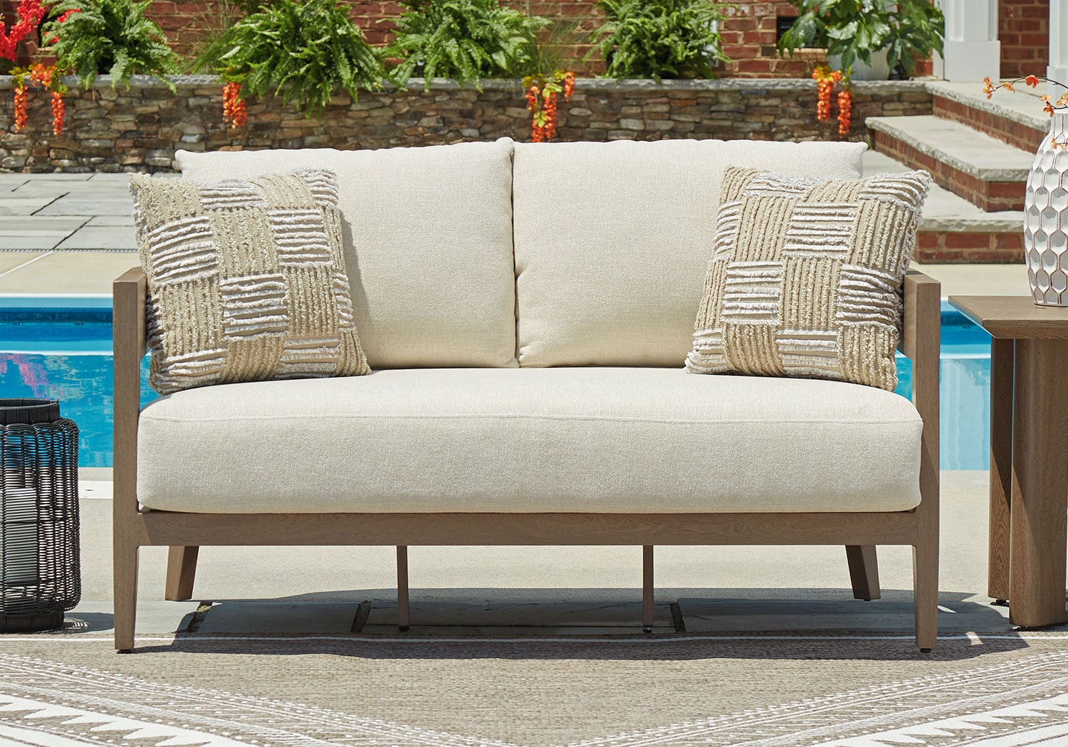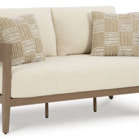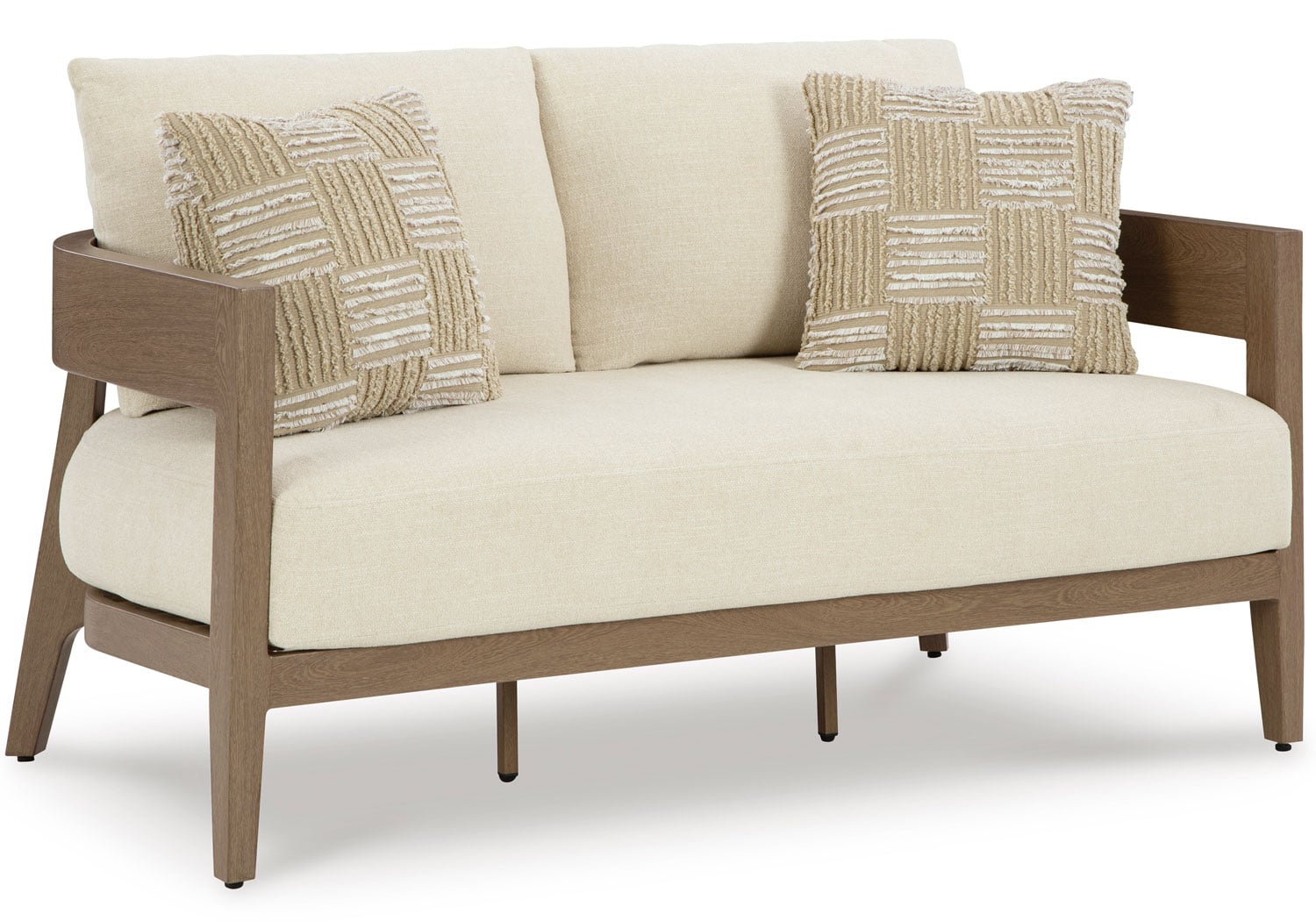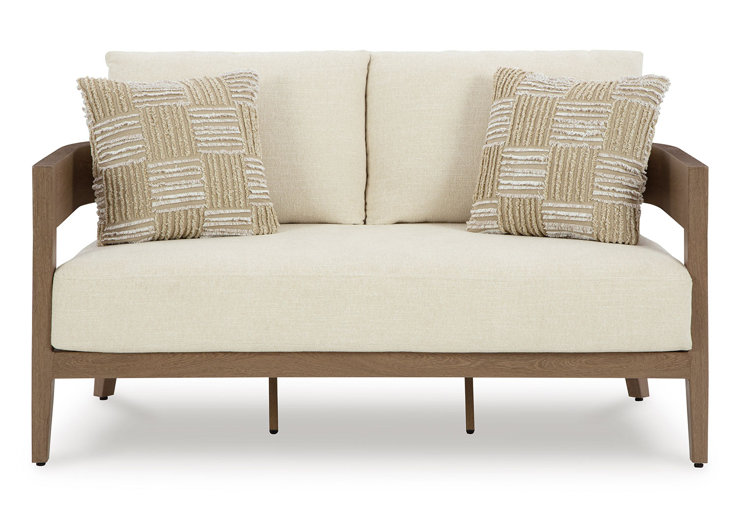 Elevate the appeal of easy-breezy living with this outdoor loveseat. Made to look like wood yet durable enough to weather the elements, it’s sure to serve you and your besties well, year after year. The gently curved piece features cushions wrapped in Nuvella+™ high-performance fabric for plush refinement. Patterned accent pillows infuse delightful texture.