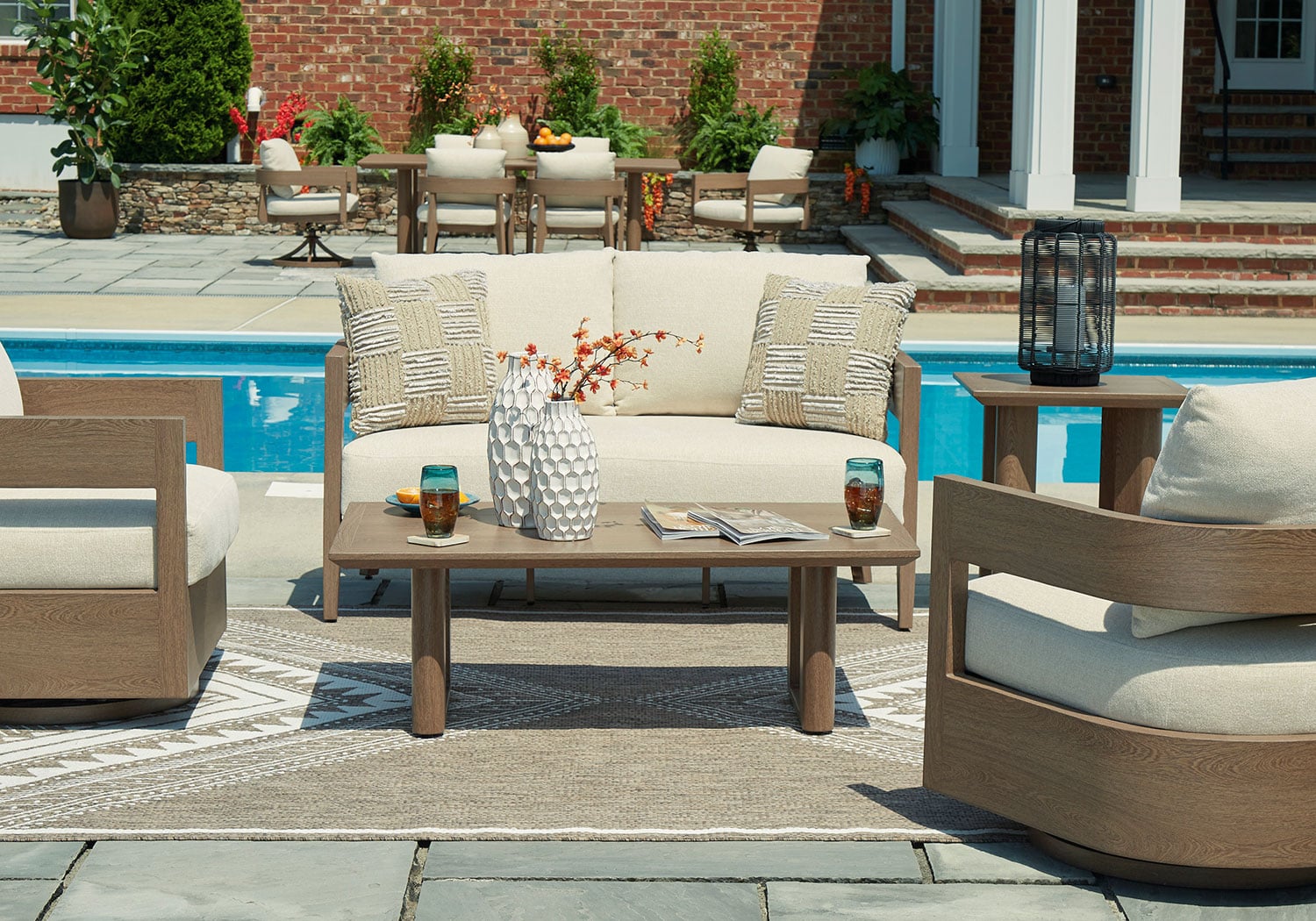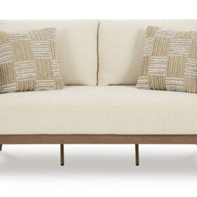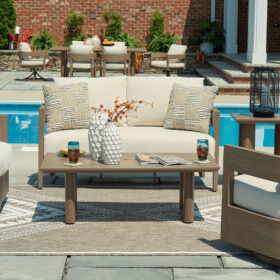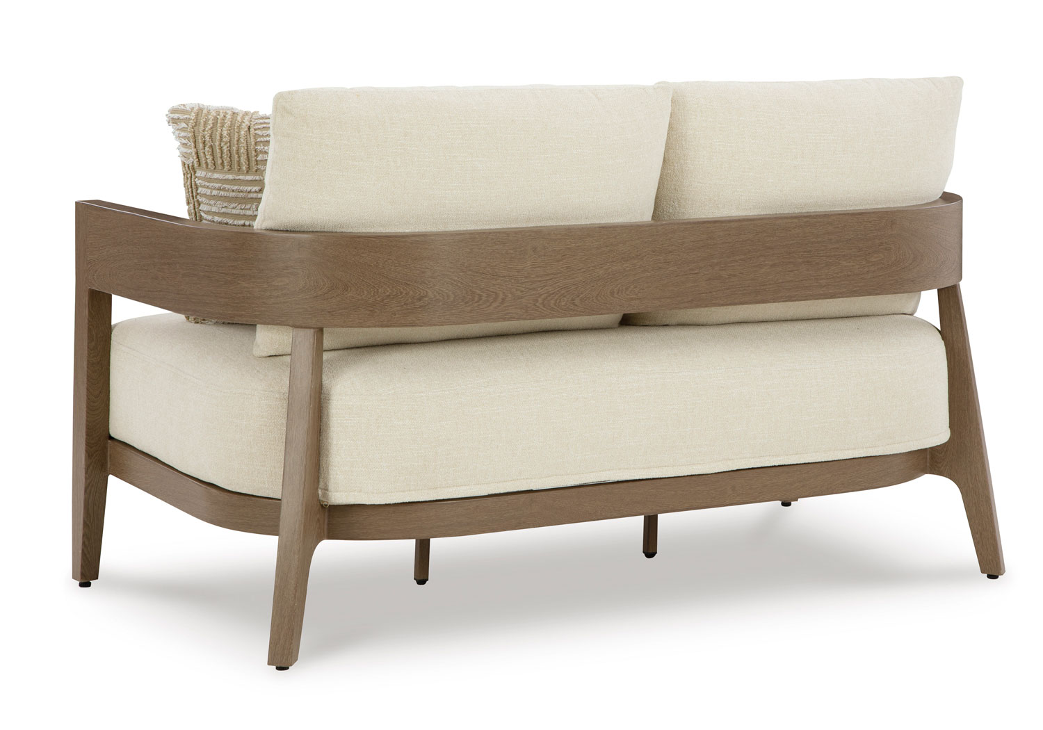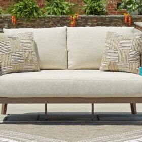 Elevate the appeal of easy-breezy living with this outdoor loveseat. Made to look like wood yet durable enough to weather the elements, it’s sure to serve you and your besties well, year after year. The gently curved piece features cushions wrapped in Nuvella+™ high-performance fabric for plush refinement. Patterned accent pillows infuse delightful texture.