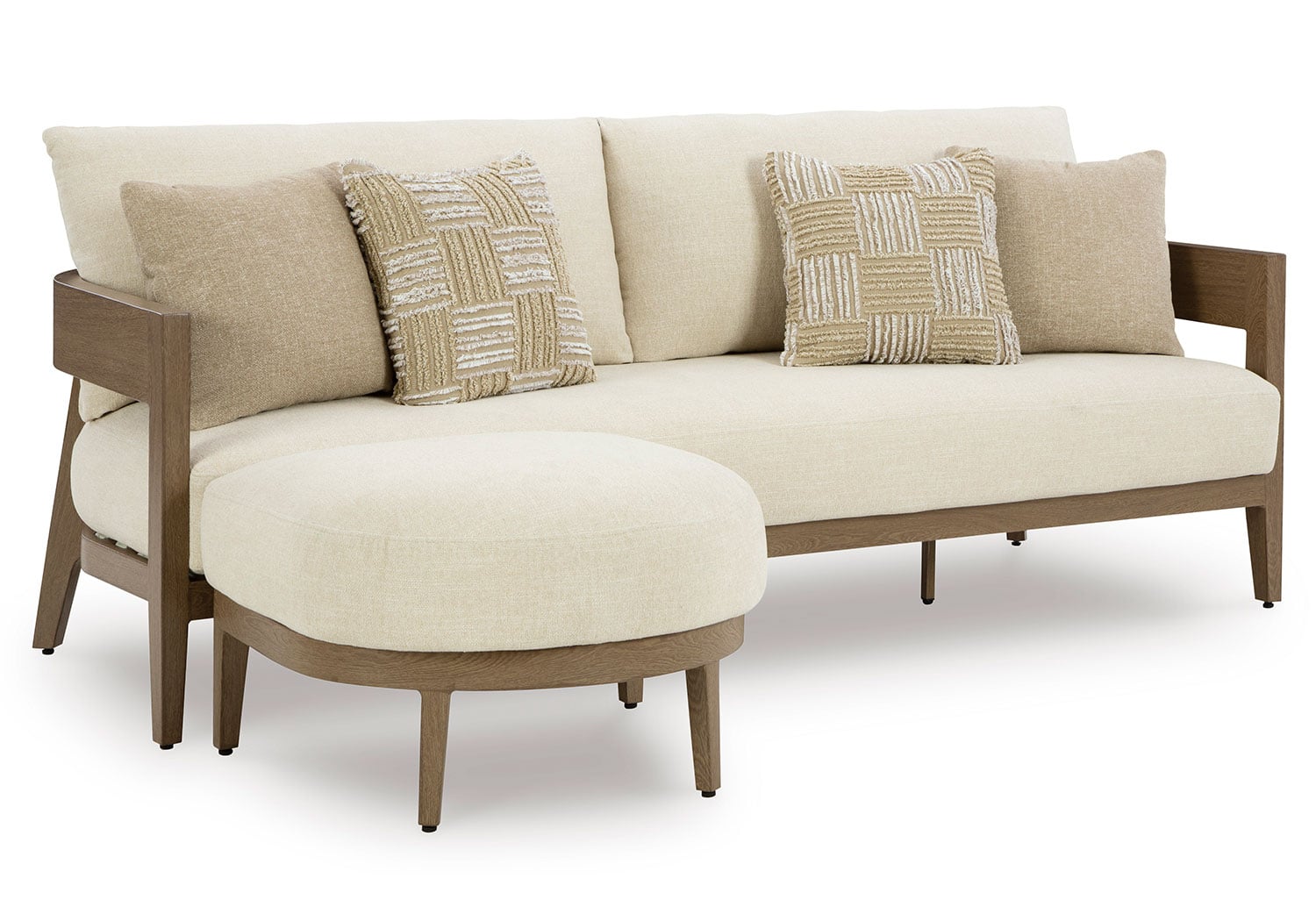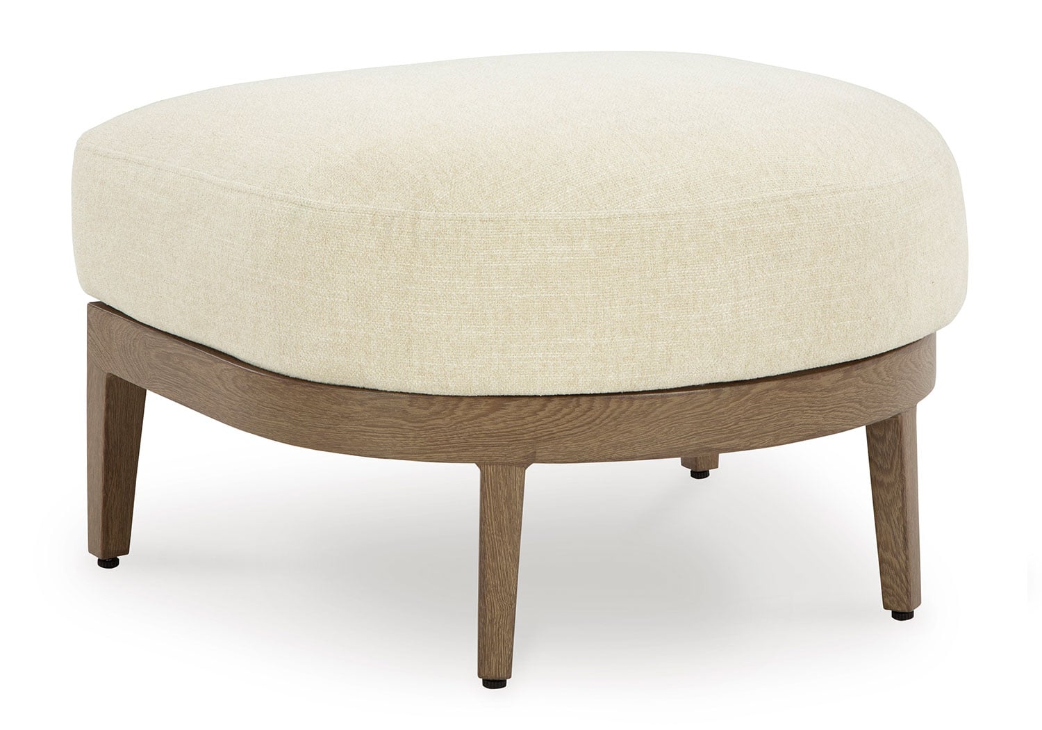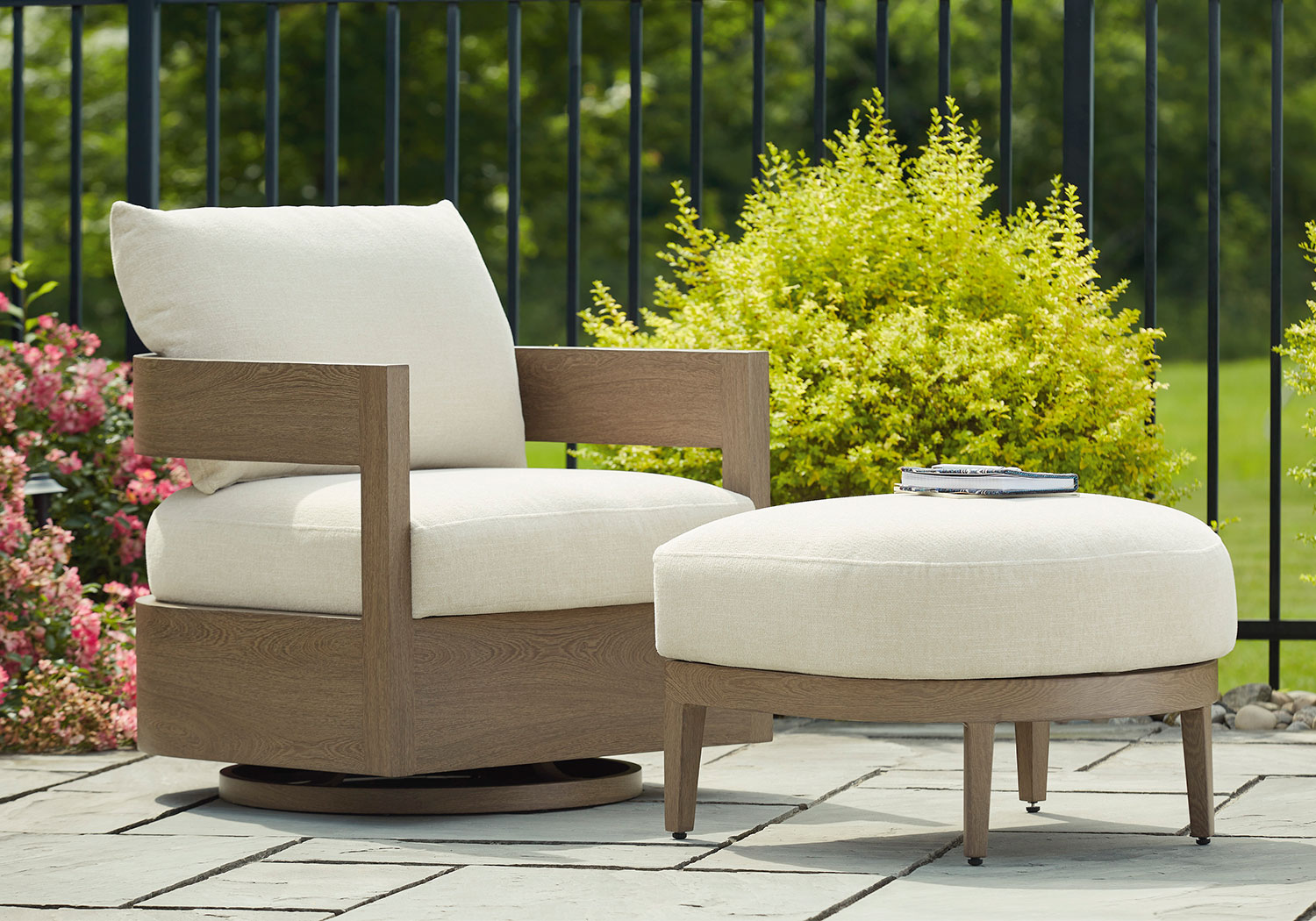 Elevate the appeal of easy-breezy living with this outdoor ottoman. Made to look like wood yet durable enough to weather the elements, it’s sure to serve you and your besties well, year after year. The gentle curve of the frame is echoed in the cushion, which is covered in Nuvella+™ high-performance fabric. Talk about plush refinement.