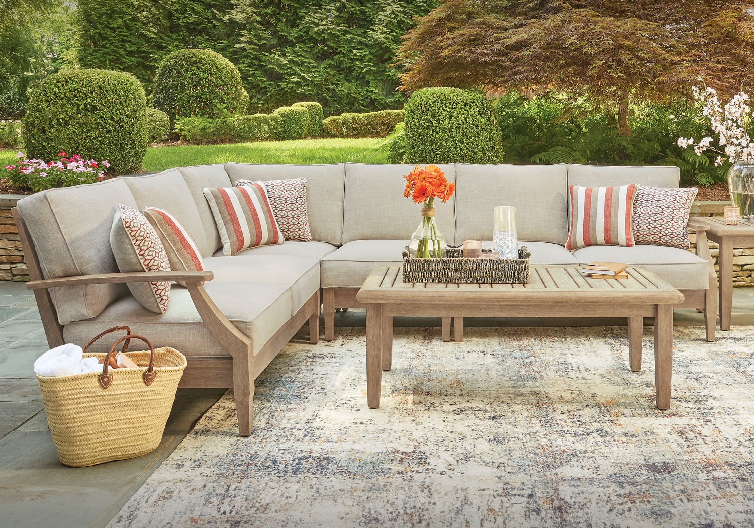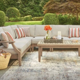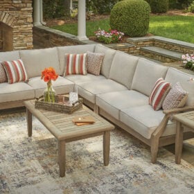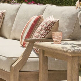 An effortlessly elegant choice in outdoor furniture, this sectional marries sturdiness and style in such a delightful way. Its eucalyptus wood frame, with tapered touches and slat styling, is treated to a 5-step finishing process for that much more weather protection. Sumptuously soft yet remarkably durable, the included cushions are wrapped in high-performing, low-maintenance Nuvella® fabric that you’re sure to love.