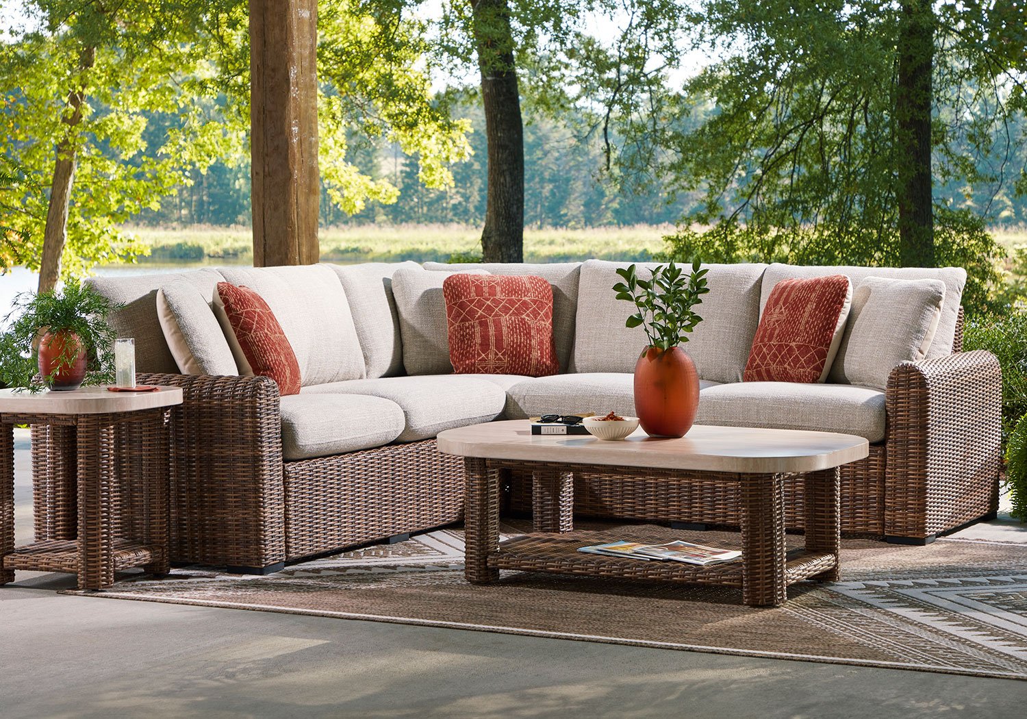 Get back to nature with the relaxed styling of this outdoor sectional. Crafted with a sturdy aluminum frame and resin wicker, it offers exceptional durability and style. The sectional’s plush cushions, covered in high-performance Nuvella® fabric, are as resilient as they are attractive. Sounds like fabulous form and function to us.