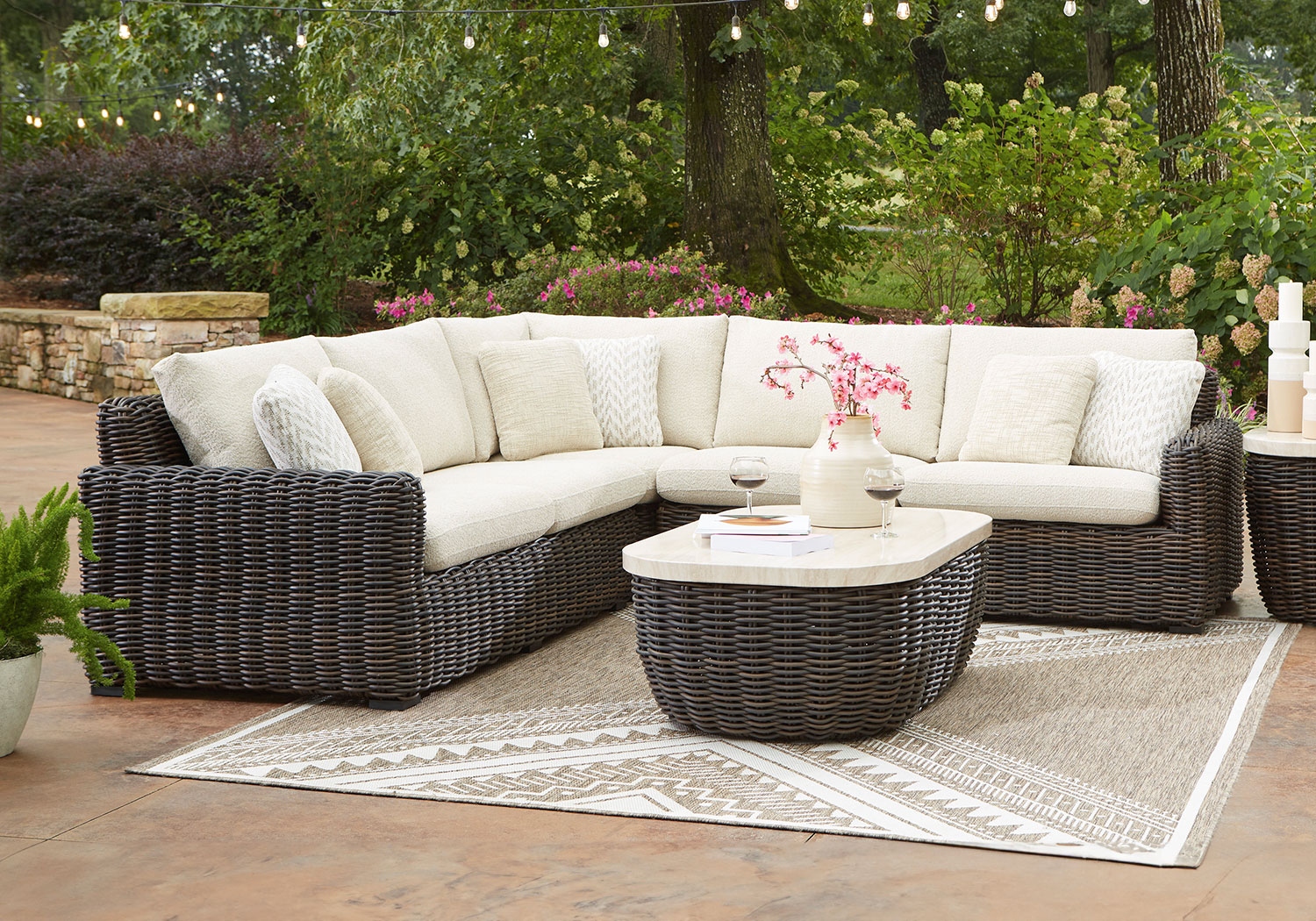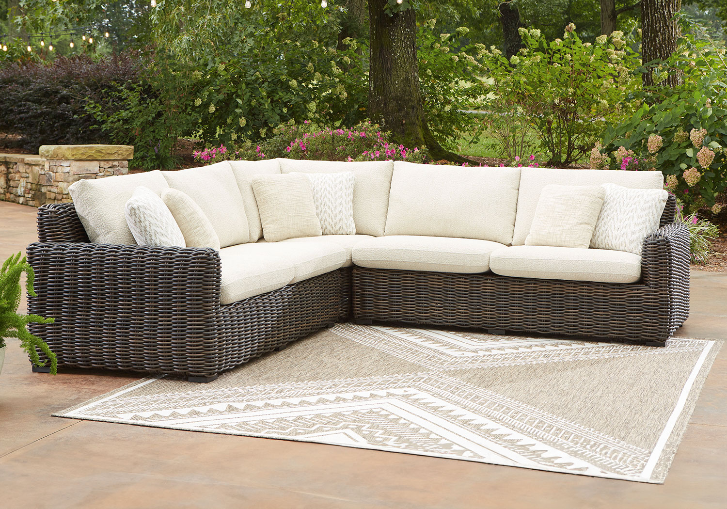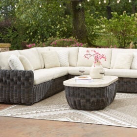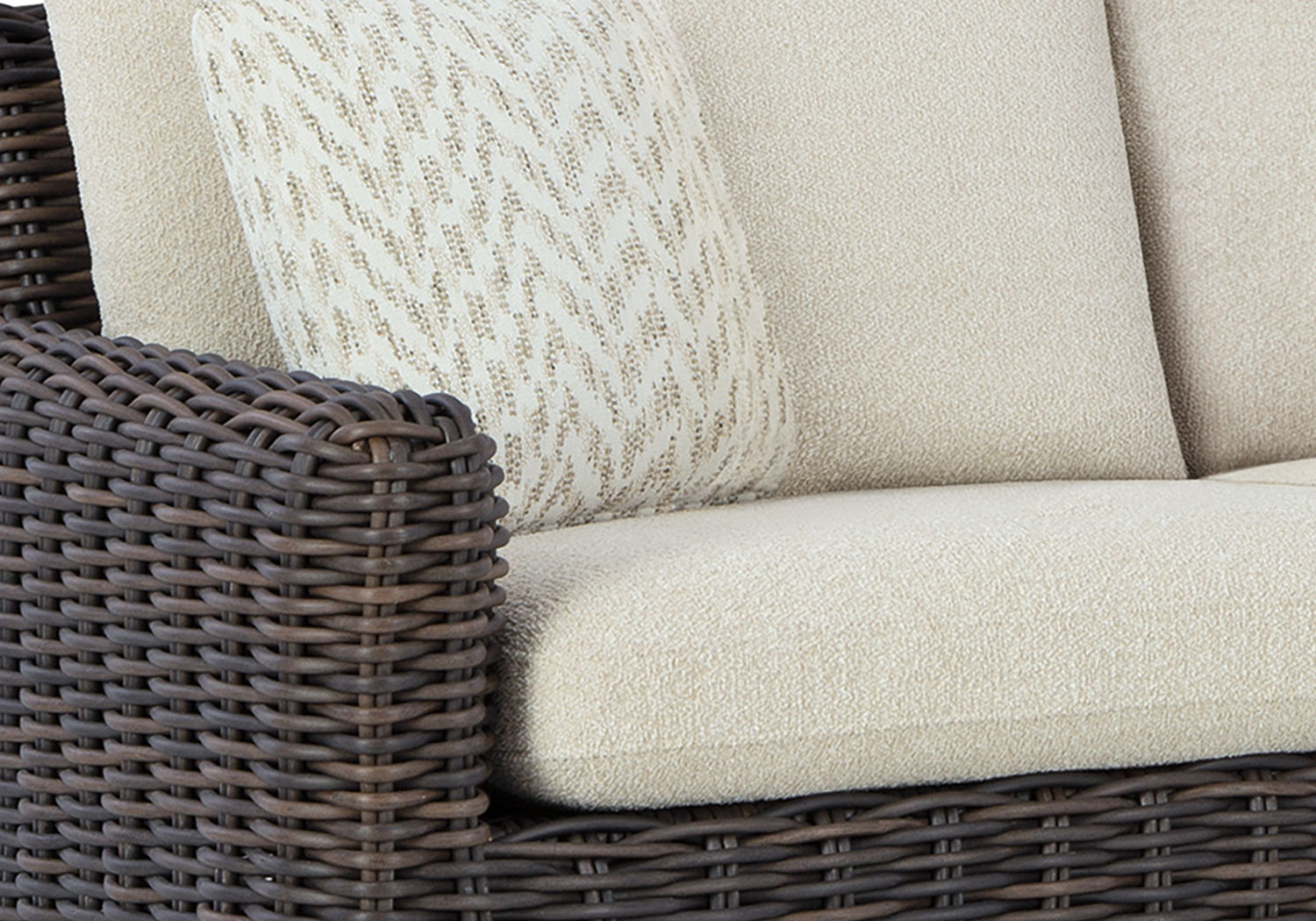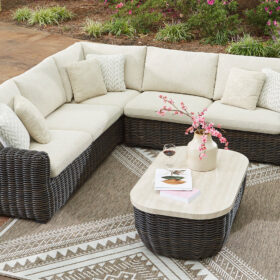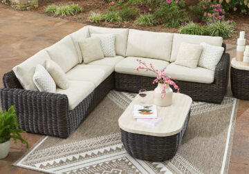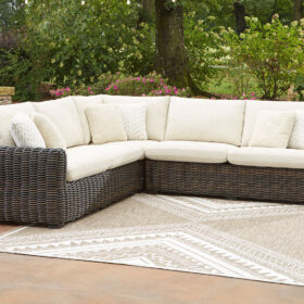 Add luxury, comfort and durability to alfresco fun. This outdoor sectional captures the textural beauty of wicker while withstanding the elements, from rain to shine. With a UV-resistant design, the wonderfully low-maintenance Nuvella+™ fabric maintains its good looks over time. Deep, roomy seating completes the piece, offering ample space to sprawl out.