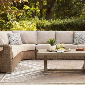 Who says the great outdoors isn’t made for luxury living? This outdoor sectional offers all of the high-end design, plush comfort and durability you could ask for, and then some. Its all-weather aluminum frame and resin wicker provide the easy-breezy look you love without the high maintenance. And rest assured—the high-performing Nuvella® fabric is made to stand up to the elements.