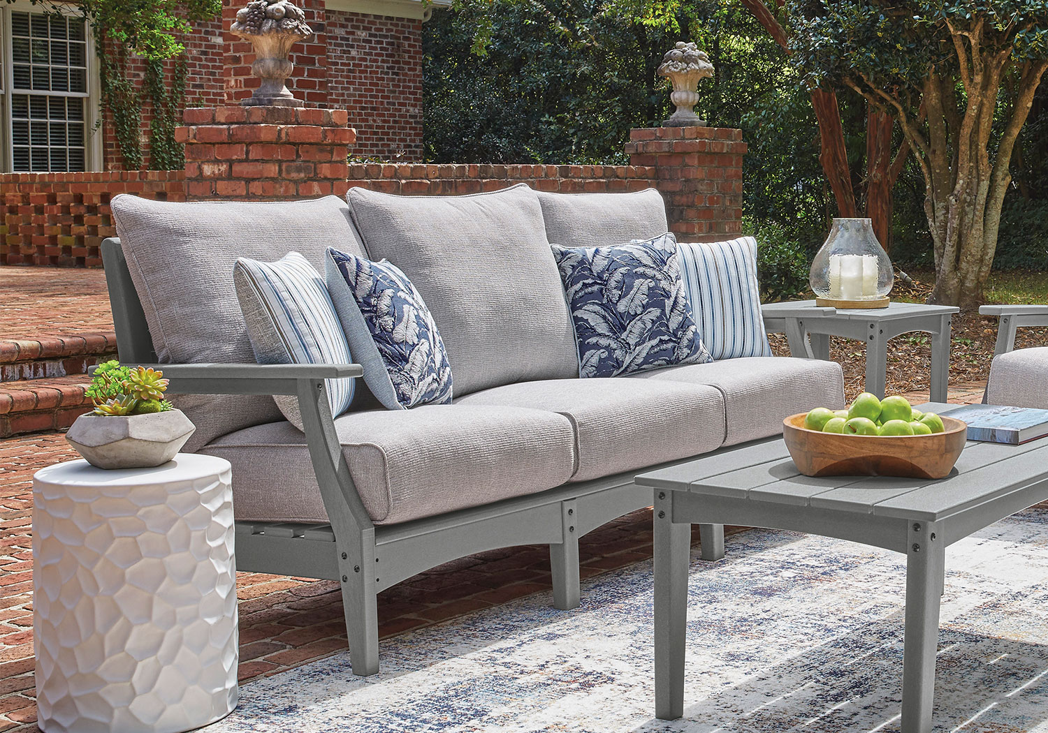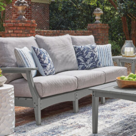 This outdoor sofa prioritizes versatile style and comfort, all while providing the durability you need alfresco. Crafted with a sturdy wood-look material in gray, it withstands the elements with ease. Cleanable and UV-resistant Nuvella® fabric rounds out the piece with added function.