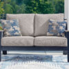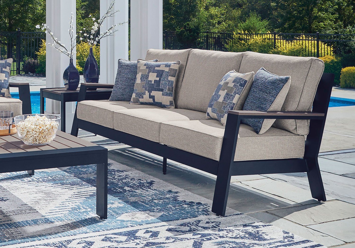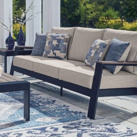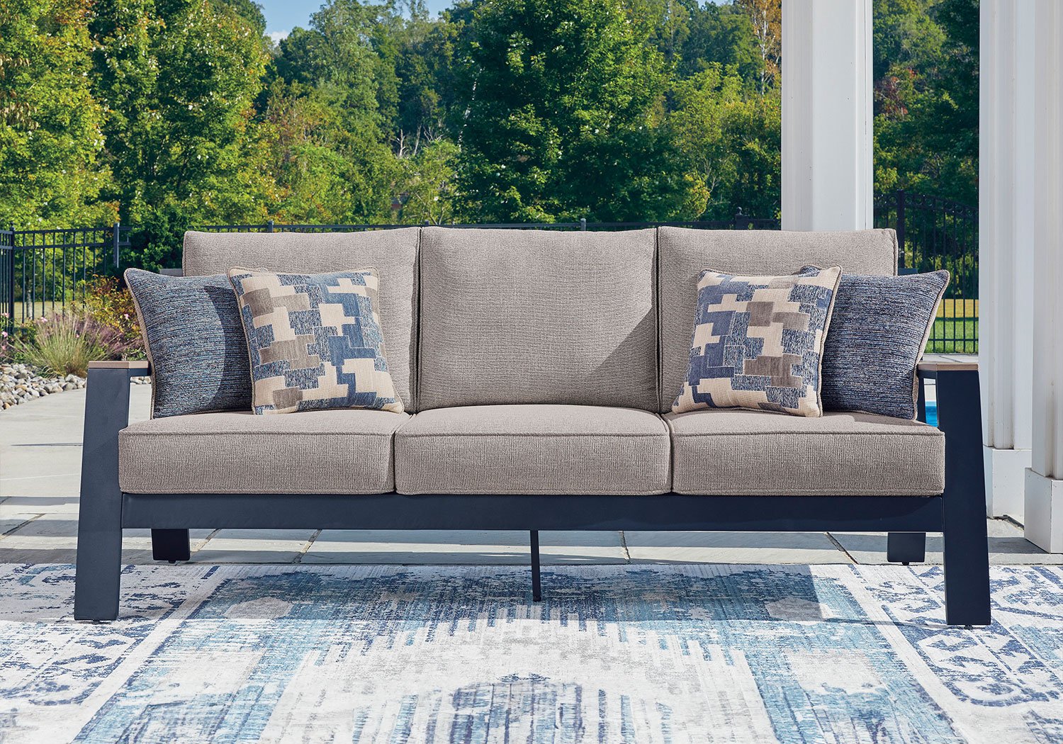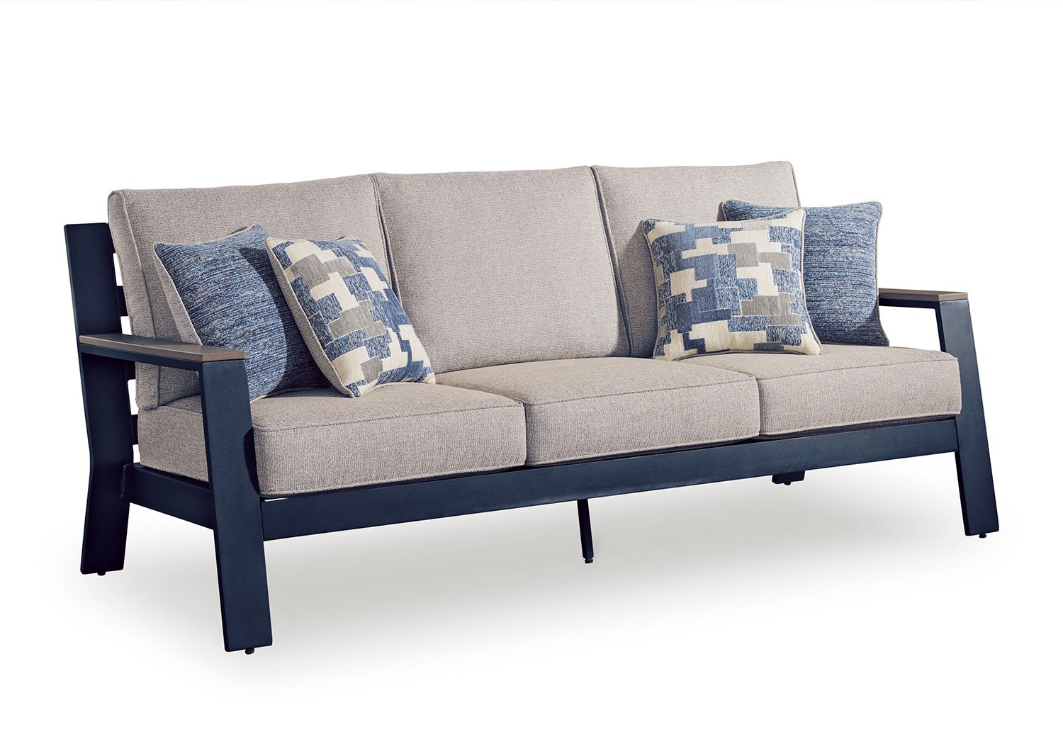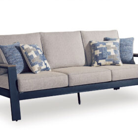 Easy-breezy beauty, made to withstand the elements. This outdoor sofa makes a serene statement with its soothing shade of blue and contrasting wood-look arms. A cushioned seat and back keep you comfy as you lounge. Crafted with durable materials for added longevity, it’s a smartly stylish addition to your outdoor oasis.
