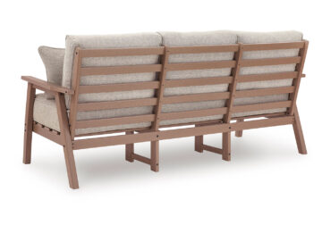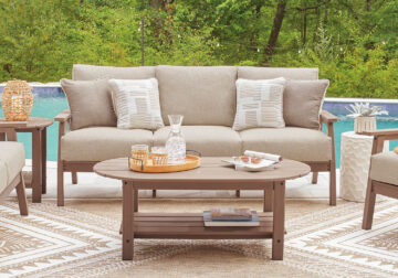 Natural neutrals are all the rage. Embrace the style trend with this outdoor sofa. Crafted with MEGA-TUFF® HDPE material, this chair combines the exceptional durability and weather resistance you need with the wood look you love. Comfy cushions wrapped in our high-performing, low-maintenance Nuvella® fabric offer stylish and durable appeal, taking outdoor living to a whole new level. Coordinating accent pillows add a wonderful layer of interest.