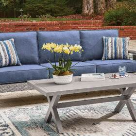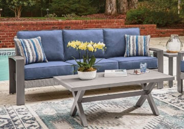 High style crafted for low-maintenance living. Turn your outdoor space into a sweet retreat with this sofa. The casually cool piece entices in an easy-breezy gray resin wicker over an all-weather aluminum frame, for an upscale aesthetic that’s downright durable. Its plush seat cushions, wrapped in high-performance Nuvella® fabric, are indulgently comfortable yet so easy to maintain. Accent pillows add delightful flair.