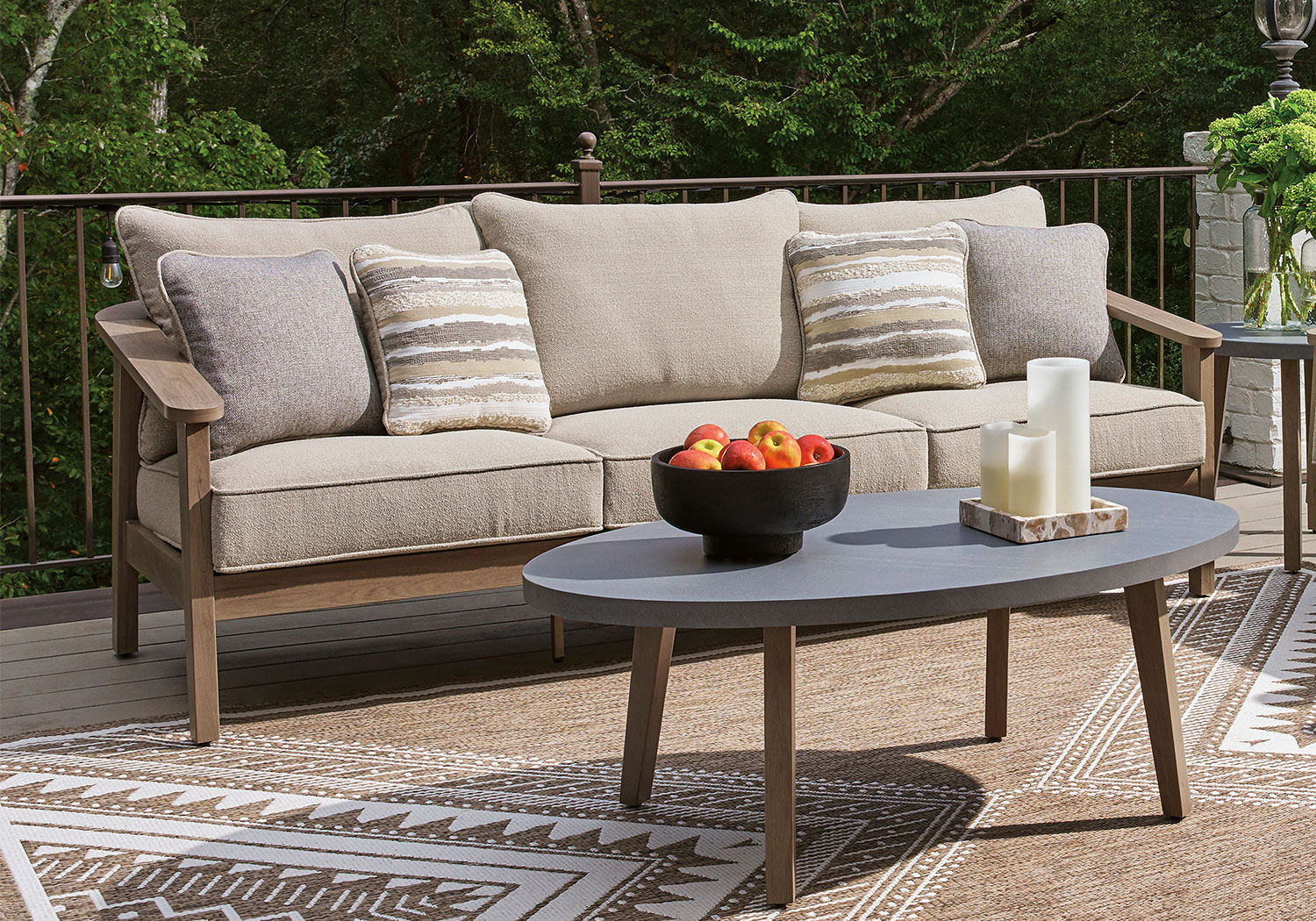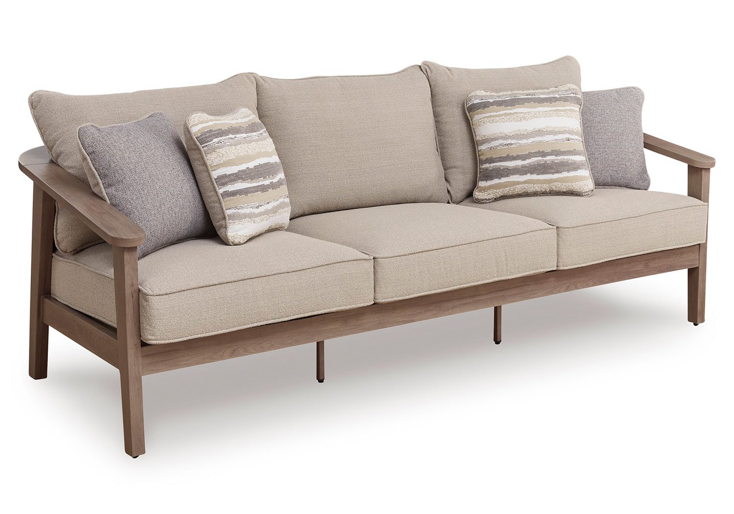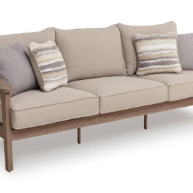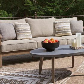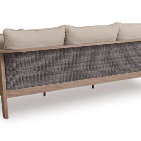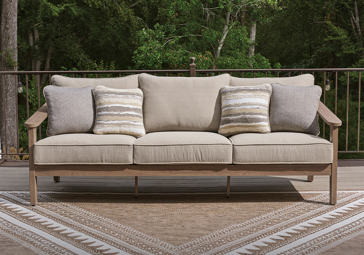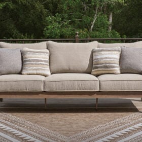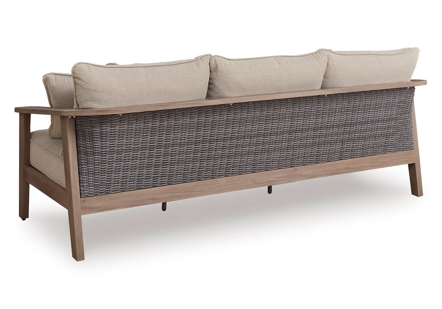 High style, meet sleek durability. This outdoor sofa combines a contemporary silhouette with must-have longevity, so you can bring your eye for design alfresco. It impresses with the refined appeal of woven resin wicker and wood-look aluminum in a chic neutral color. And for easy cleanability and UV resistance, high-performing Nuvella® fabric covers the cushions.