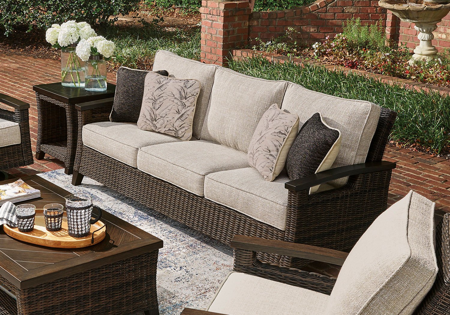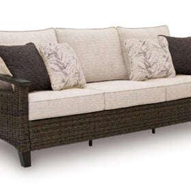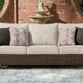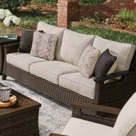 Looking for that special spot to relax and entertain on your deck or patio? Then you’ll love this outdoor sofa. With beautifully textured resin wicker over a sturdy aluminum frame, it brings so much style and warmth to your outdoor space. The thick, comfortable cushions are covered in cleanable, UV-resistant Nuvella® fabric, so you can spend less time worrying and more time chilling. What a smart and stylish way to create a beautiful, lasting space for everyone to enjoy.