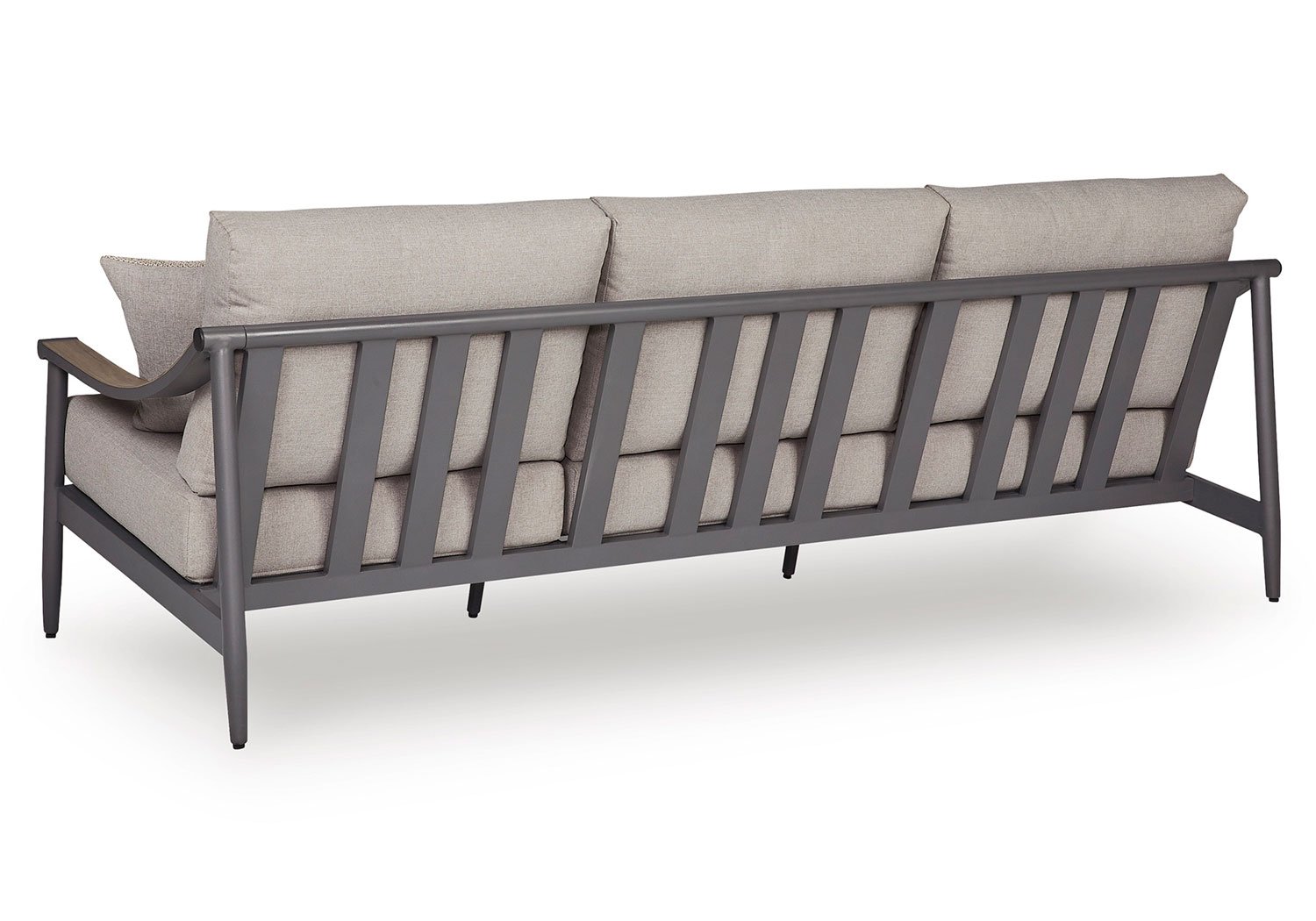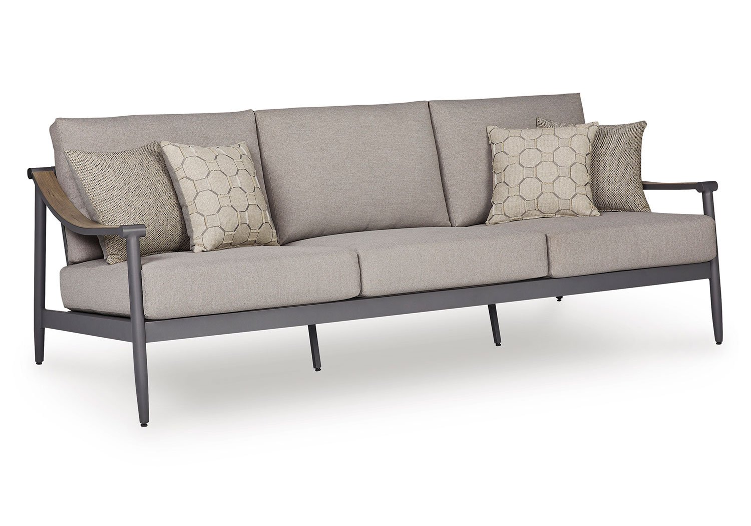A refined marriage of style and durability, this outdoor sofa adds contemporary flair to your porch or patio. Wood tones and shades of gray lend a versatile, neutral appeal. And this sofa is built to last, thanks to its rust-resistant frame and cleanable, UV-resistant fabric.