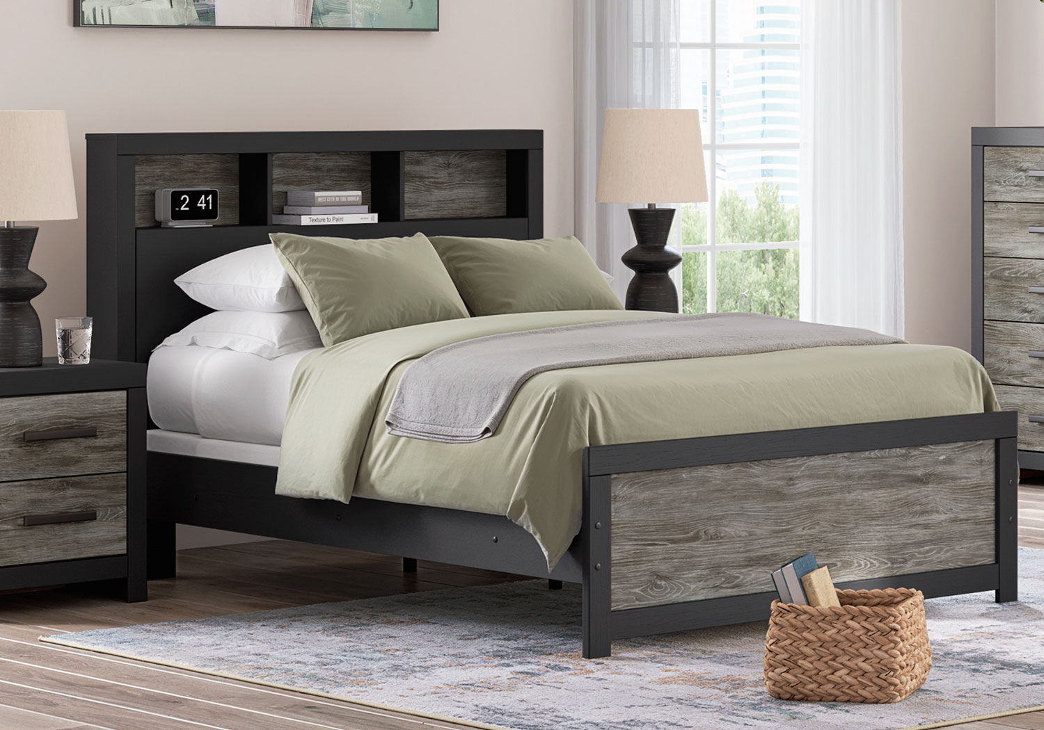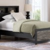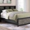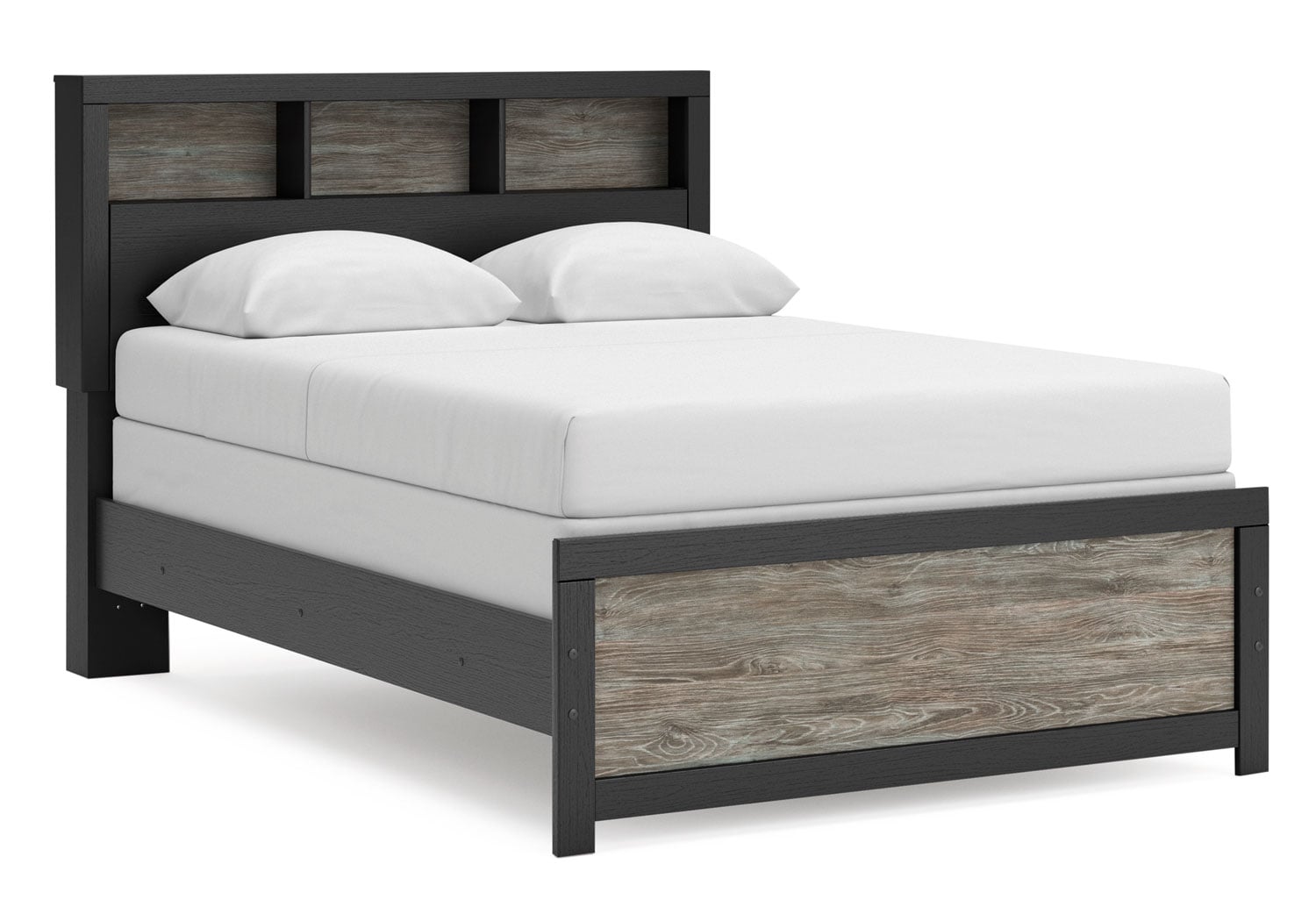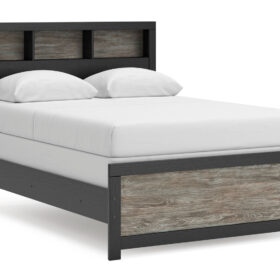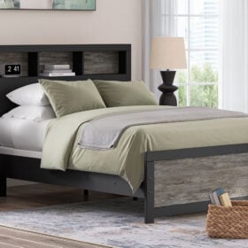 Comfy, functional and versatile, this bookcase Series evokes the tranquil vibe you long for in your dream destination. Its two-tone textured look marries a rustic gray finish and a matte black finish over replicated oak grain for neutral appeal. Three open cubbies in the headboard add space-saving storage, keeping favorite reads, bedtime essentials and so much more within easy reach.