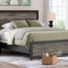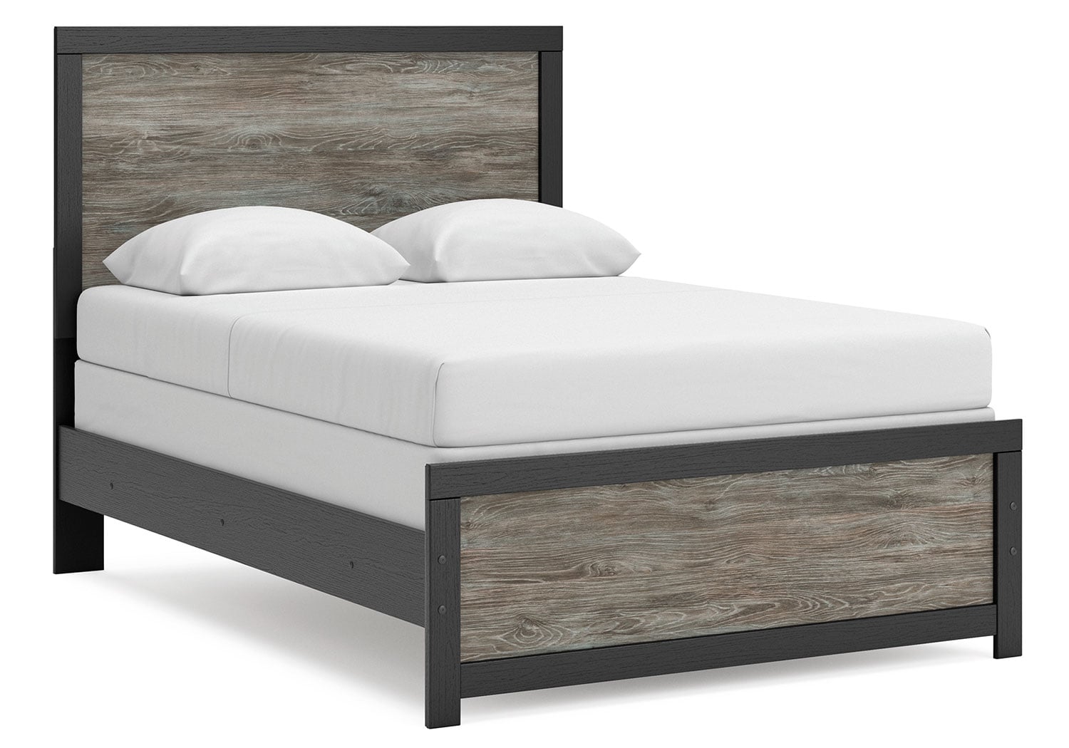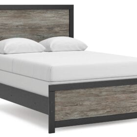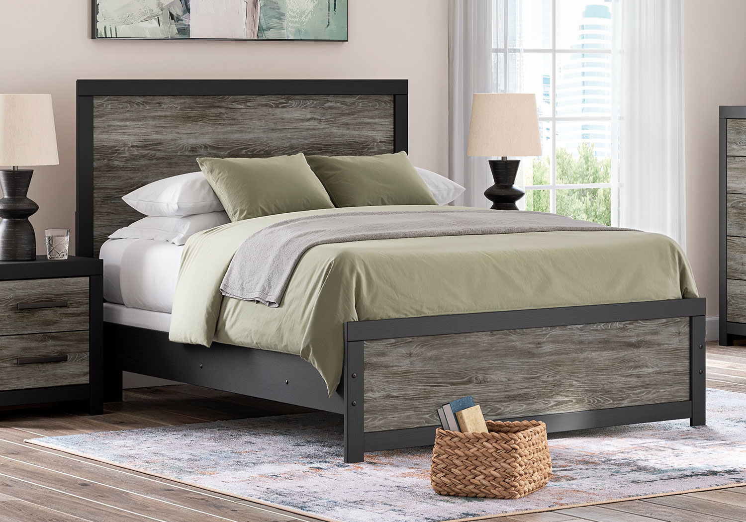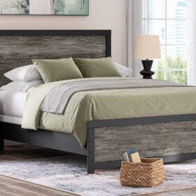 Made with engineered wood (MDF/particleboard/plywood) and decorative laminate for the right balance of affordability and durability. Two-tone finish (warm gray finish and matte black finish with replicated oak grain). Decorative laminate replicates natural or man-made material surfaces with consistent color, pattern and texture. Foundation/box spring required.
