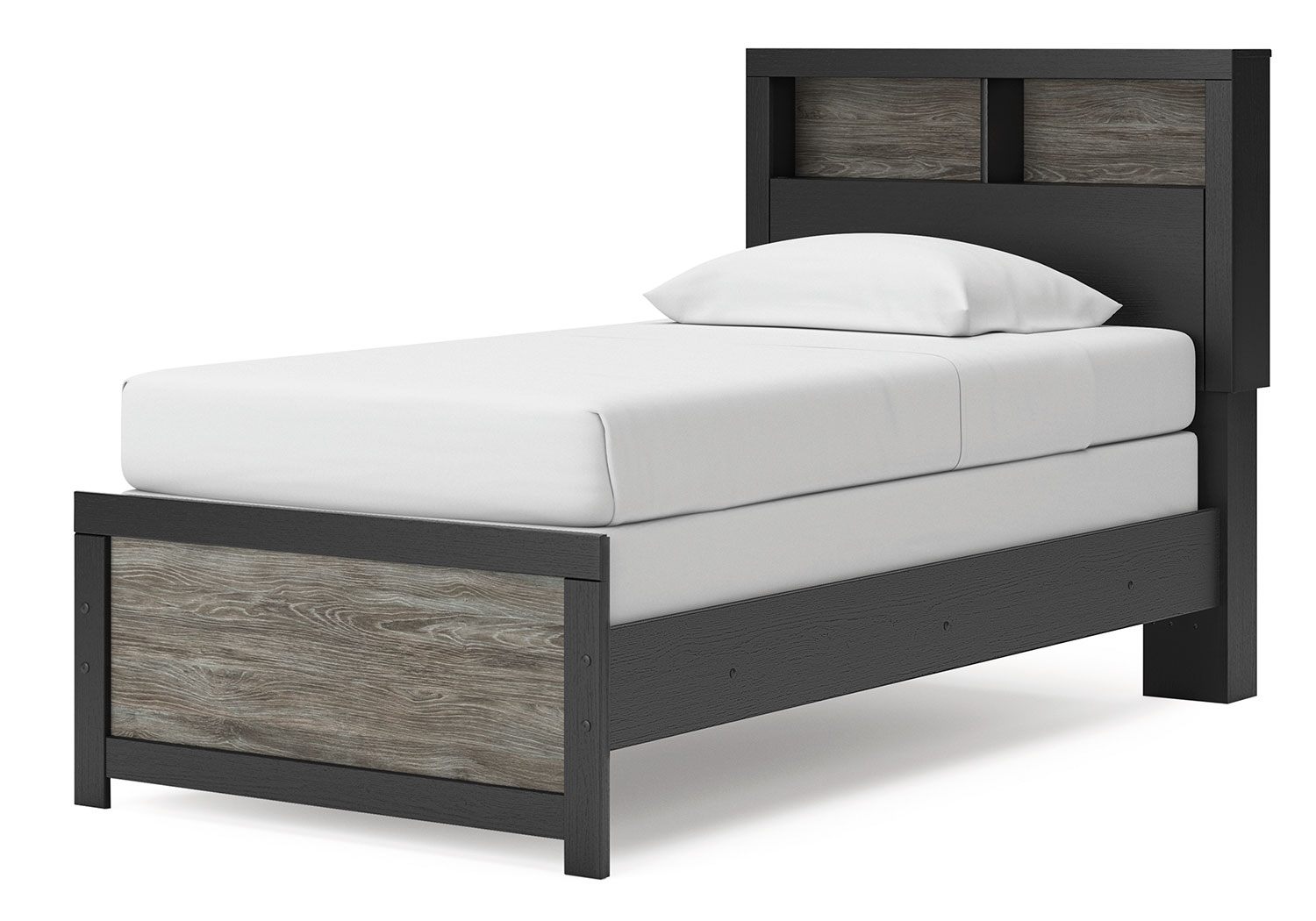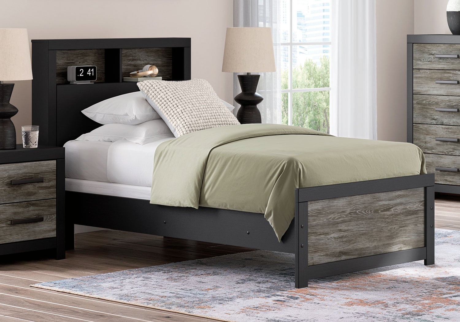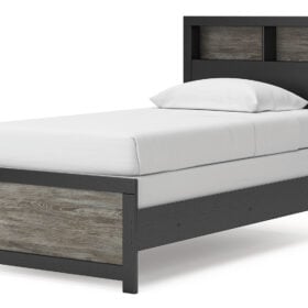 Comfy, functional and versatile, this bookcase Series evokes the tranquil vibe you long for in your dream destination. Its two-tone textured look marries a rustic gray finish and a matte black finish over replicated oak grain for neutral appeal. Three open cubbies in the headboard add space-saving storage, keeping favorite reads, bedtime essentials and so much more within easy reach.